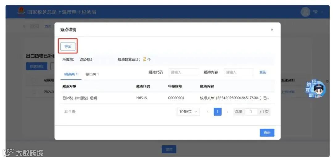 点击【自检查询】按钮,弹出“疑点详情”页面。可点击“警告类”“错误类”切换页面。点击“导出”可将疑点信息导出成Excel文档。