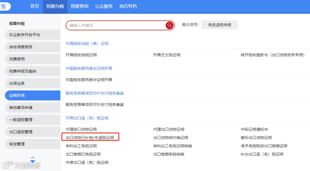 登录电子税务局,点击【我要办税】-【证明开具】-【开具出口退(免)税证明】-【出口货物已补税/未退税证明】