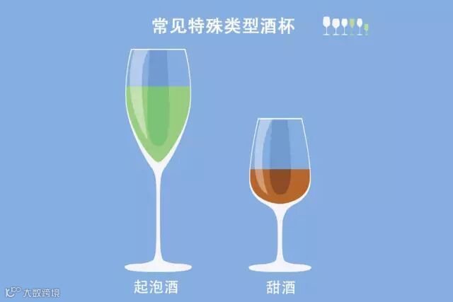 除了红白葡萄酒,常见的葡萄酒种类还有很多。因此对于一些特殊类型的葡萄酒如起泡酒和甜酒等,一般需要特殊的杯型(如图)。