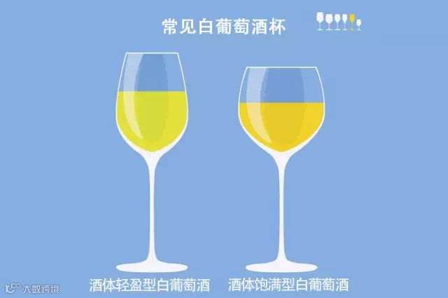 和红葡萄酒相反,白葡萄酒的酒杯口一般较窄。一来可以更多地保持其花香;二来可以更好地维持冰镇后的低温;同时 U 型杯肚更利于释放香气。当然也有例外,从下图可得知,一些经橡木桶陈年的霞多丽(Chardonnay)或维欧尼(Viognier)等酒体饱满型白葡萄酒也需要杯口较宽的酒杯。