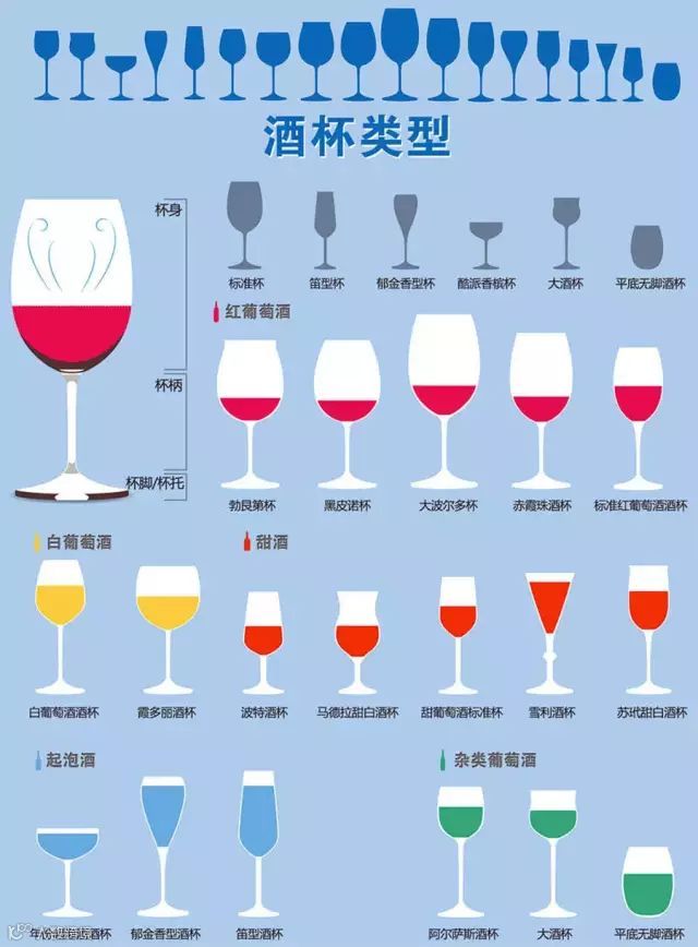 尽管葡萄酒有多种不同杯型,但基本形状差异不大,都由杯身、杯柄和杯脚构成。除了葡萄酒外,采用这种杯型的酒类/饮料还有很多(如下),可见这种杯型的确是非常受欢迎的。