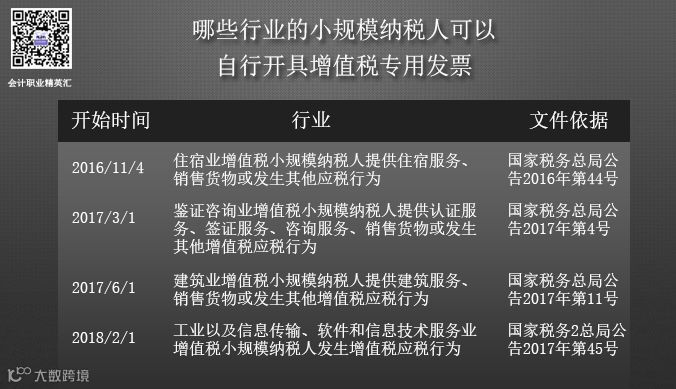 为了方便大家对比学习,我给大家总结一下哪些行业的小规模纳税人可以自行开具增值税专用发票,列明了时间和政策文件号,也方便小伙伴去查找相关政策。