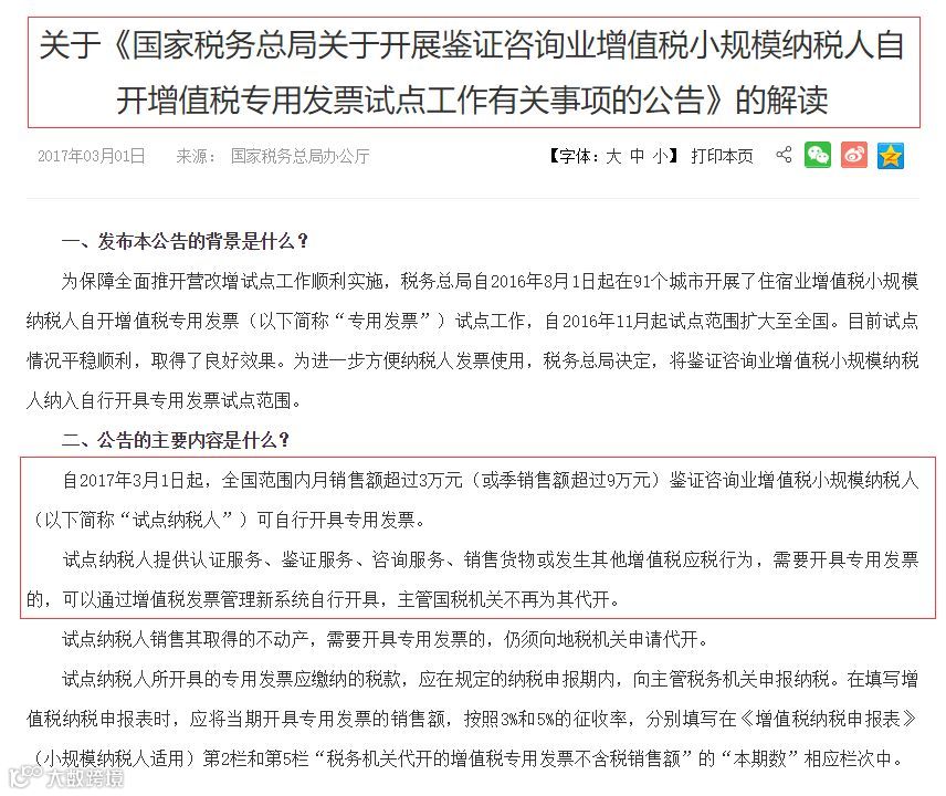 “全国范围内月销售额超过3万元(或季销售额超过9万元)的鉴证咨询业增值税小规模纳税人(以下简称“试点纳税人”)提供认证服务、鉴证服务、咨询服务、销售货物或发生其他增值税应税行为,需要开具专用发票的,可以通过增值税发票管理新系统自行开具,主管国税机关不再为其代开。”