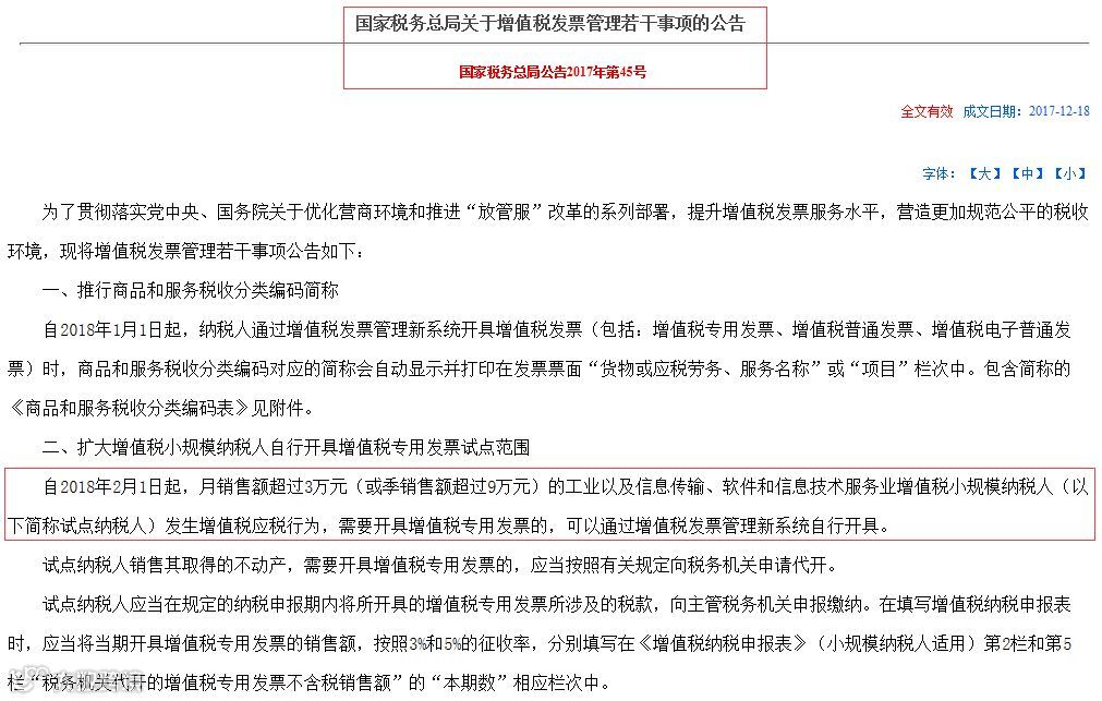 自2018年2月1日起,月销售额超过3万元(或季销售额超过9万元)的工业以及信息传输、软件和信息技术服务业增值税小规模纳税人(以下简称试点纳税人)发生增值税应税行为,需要开具增值税专用发票的,可以通过增值税发票管理新系统自行开具。