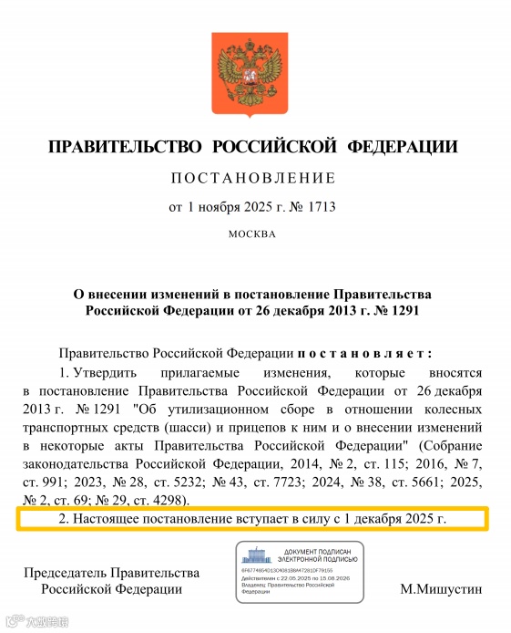 俄罗斯联邦政府于 11 月 1 日正式发布第 1713 号决议,对 2013 年实施的第 1291 号进口车报废回收费法规进行重大修订,新规将于 2025 年 12 月 1 日起正式生效。此次调整不仅大幅修改税率标准,更革新了税费计算逻辑,新增发动机功率作为核心计税依据,标志着俄罗斯对进口车辆的管理进入 “排量 + 功率” 双重管控时代。