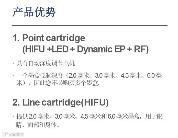 本产品的主要功能是 hifu,分为两个墨盒(Point 和 Line)。Point 墨盒可以使用 HIFU 和 LED、动态 EP 和 RF 功能。该墨盒同时输出 HIFU 和 LED,您可以选择 Dynamic EP 和 RF 一起使用。动态 EP 和 RF 不能同时输出。