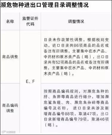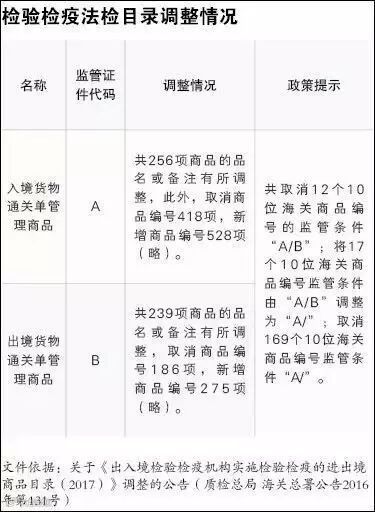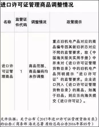 2016年12月,根据《2017年关税调整方案》对税则税目的调整情况,以及加强进出口管理的需要,商务部、环保部、质检总局、人民银行、体育总局等国家主管部门联合海关总署对2017年执行的进出口管理目录进行了调整。