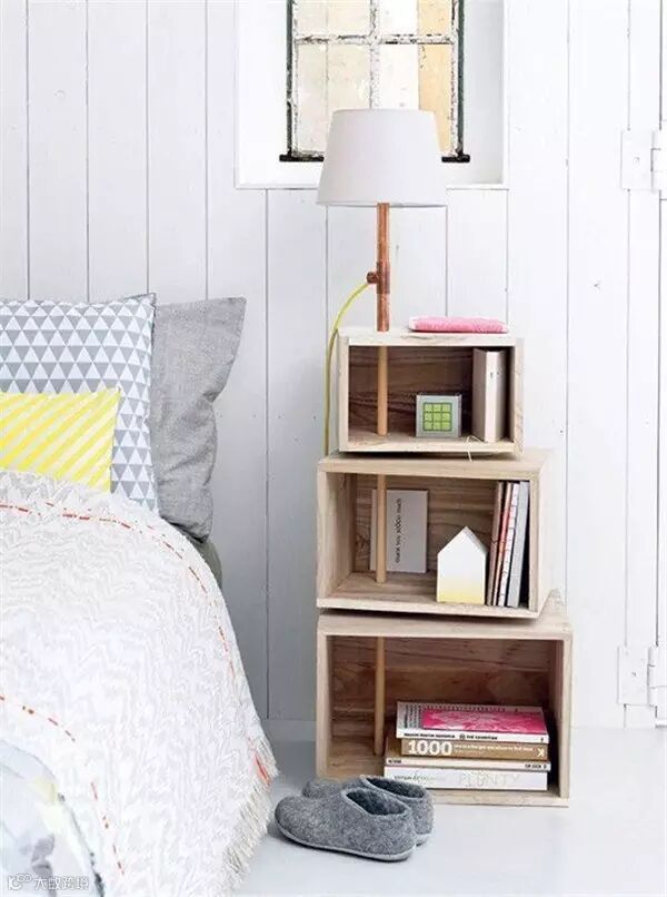 不要再去花钱买床头柜了,把家里闲置的桌桌椅椅等旧家具挪到床头,或者动手将在路边捡到的水泥废料、旧木箱、木桩装饰改造一番,就能让你拥有一个舒服又有趣的床头柜。