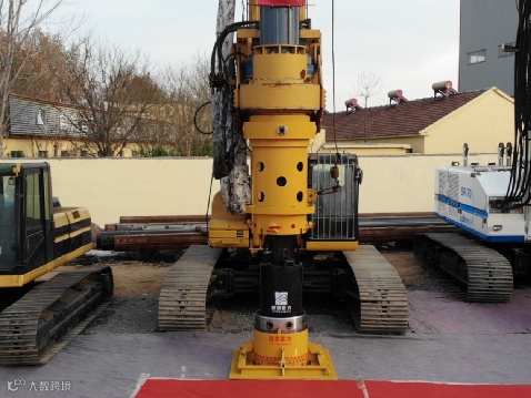 履带吊起振动锤,振动锤下部的液压钳夹住钢护筒顶端,通过内部偏心轮旋转产生的垂直振动力作用在套管上,将钢套管沉降或拔出。
