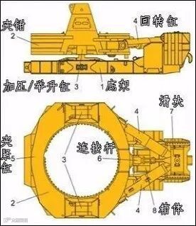 延长时,埋设套管阻力增加,使用搓管机埋设套管。搓管机一端固定在旋挖钻机底盘上,通过夹钳紧缩与套管环抱产生摩擦力,左右两侧回转油缸反复推动,实现套管转动,并通过加压/举升油缸(搓管机自重)实现加压或起拔,将套管钻入或起拔。
