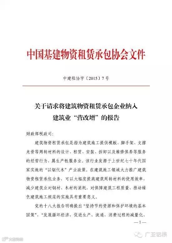 近日,协会再次向财政部和住房城乡建设部报送了“关于请求将建筑物资租赁承包企业纳入建筑业营改增的报告”,继续向两部门反映。望广大会员企业关注、支持。