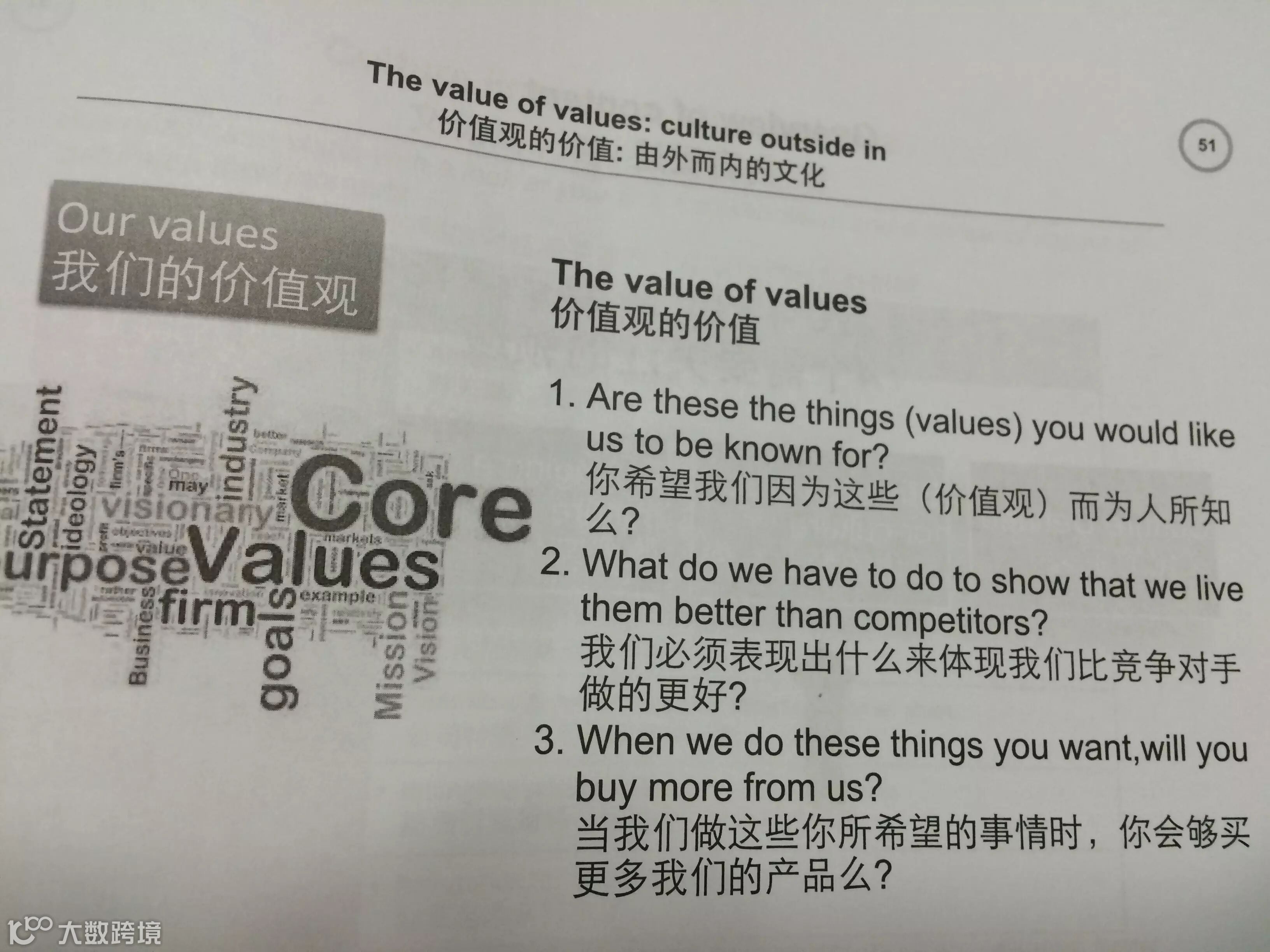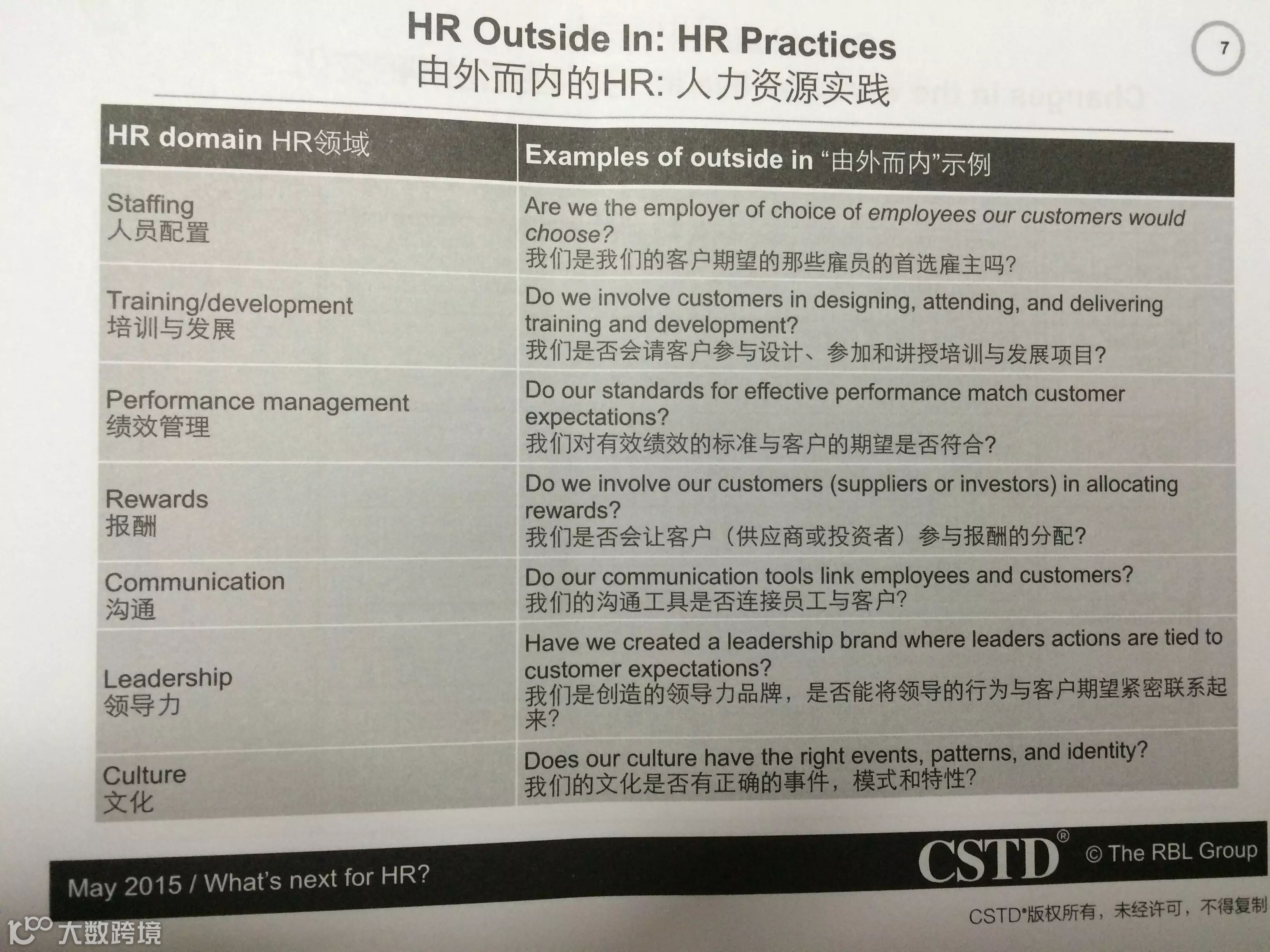 尤里奇特别提到了文化是人力资源的重要工作。尽管在中国,大量的公司没有把文化作为人力资源部门的核心工作,甚至也不是一个组织的重要工作。而我要说的是,其实文化可以是培训部门的核心工作,在很多的企业大学或培训中心,企业文化是他们的工作之一。开始我不是很理解,现在我越来越觉得培训里可以融入文化的内容。