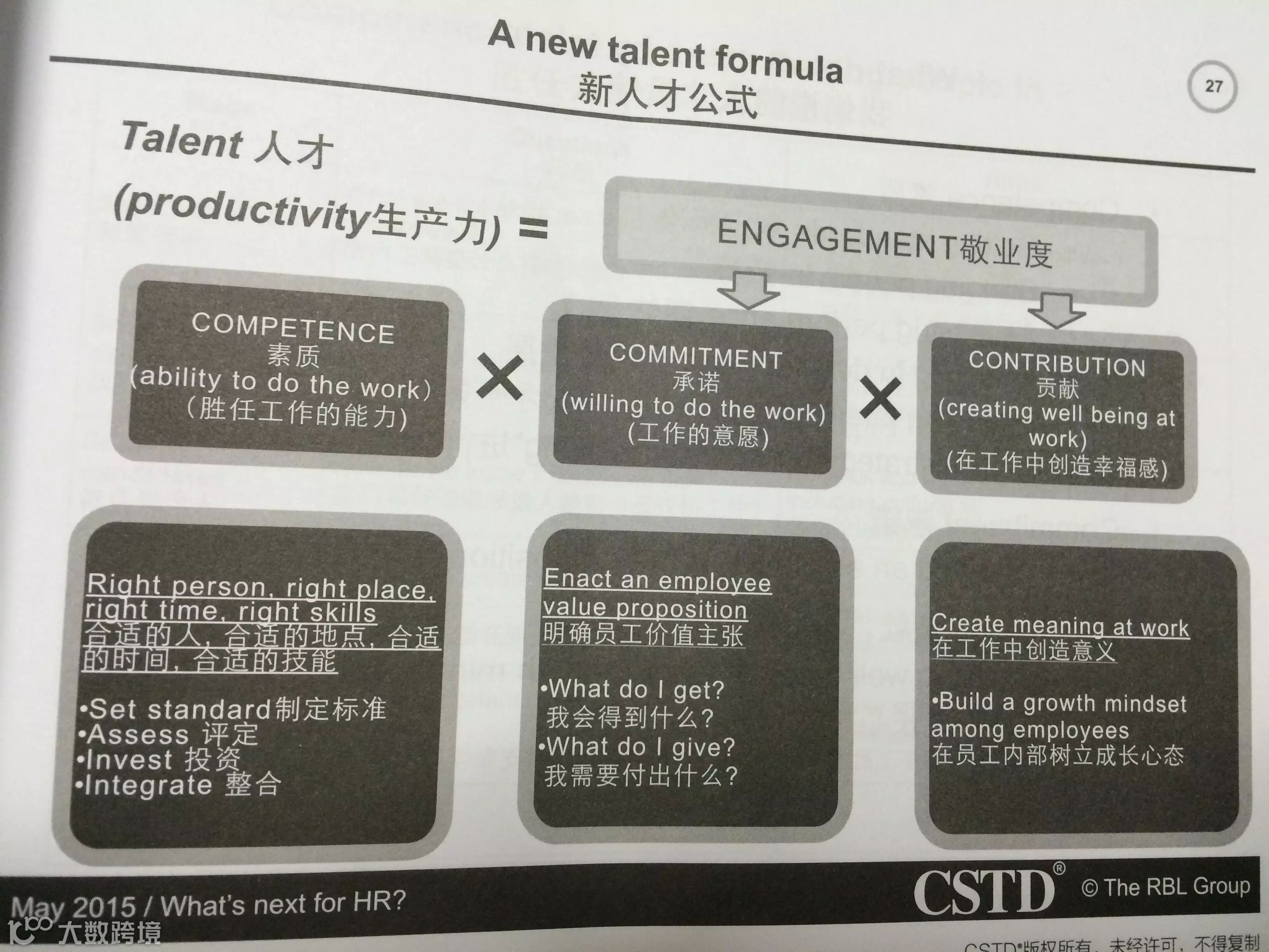 这次大师最吸引人注意的一个公式就是人才=素质*承诺*贡献。