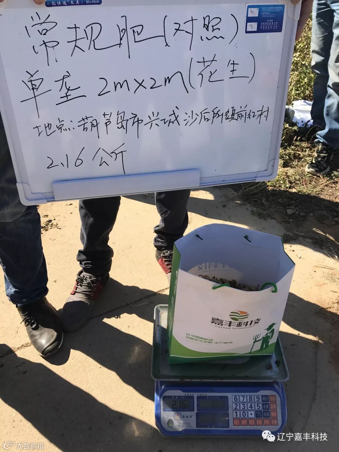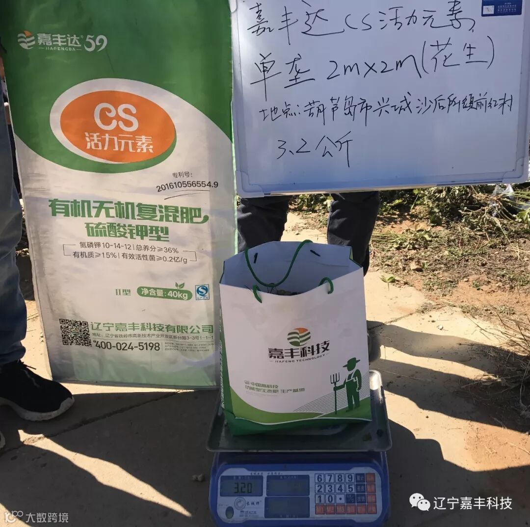 葫芦岛兴城市花生测产(施用Cs活力元素套餐肥),周边其他地块单垄2m*2m产量为2.16公斤。嘉丰达试验田单垄2m*2m产量为3.2公斤。