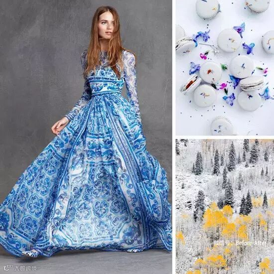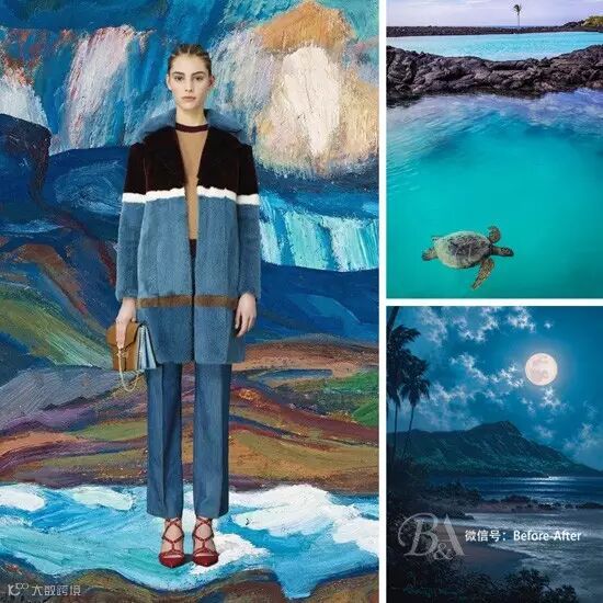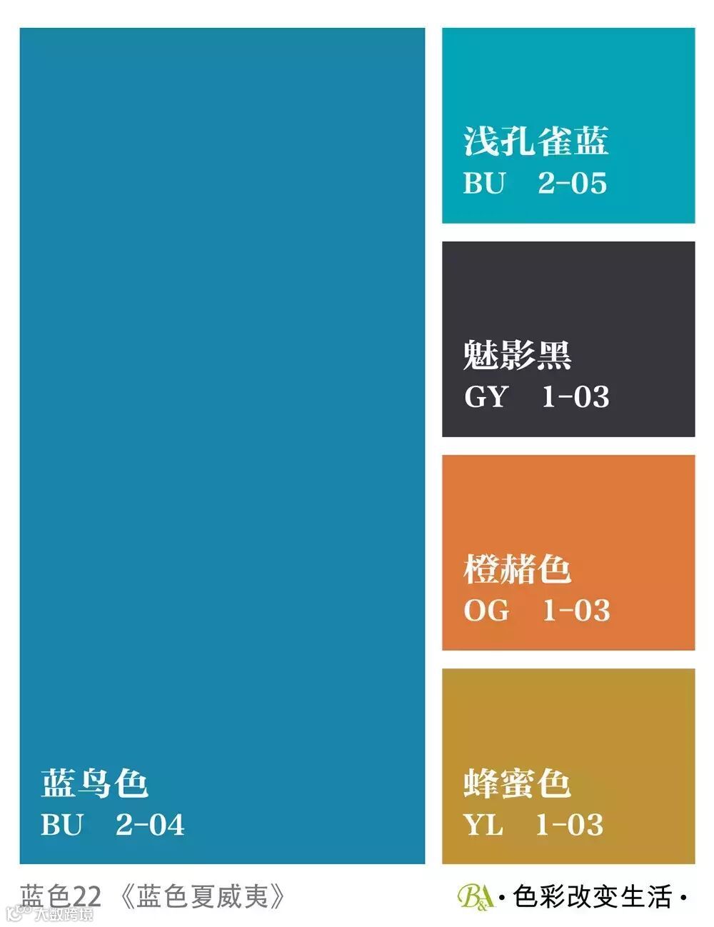 这套配色灵感来自一款鸡尾酒——蓝色夏威夷。蓝色柑香利口酒代表着蓝色的海洋,酒杯中的碎冰象征着泛起的浪花,而散发出的果汁甜味犹如夏威夷的微风细语。整个方案洋溢着蓝天白云与椰林摇曵的热带风情,见到它会让人不禁联想到蔚蓝大海、金色海滩和茂密丛林。
