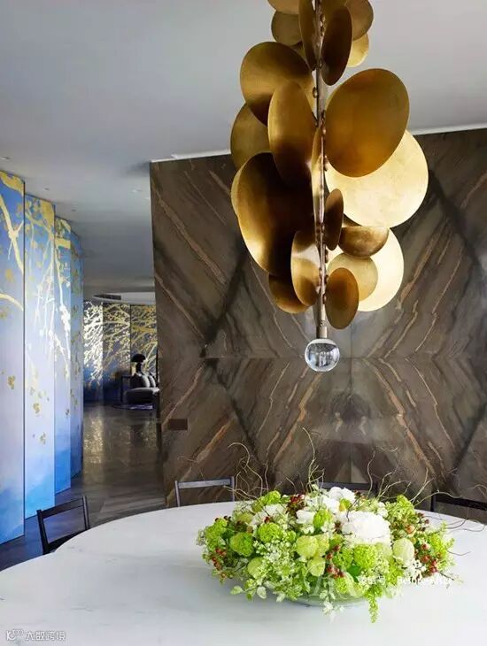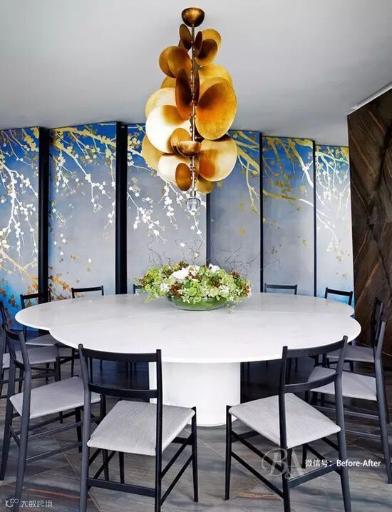 著名室内设计事务所Yabu Pushelberg由George Yabu和Glenn Pushelberg两位大师成立,他们的作品创新而独特,几乎遍布了全世界。在香港罕贵地段的傲璇住宅项目中,餐厅的设计让人眼前一亮。以百合白餐桌、餐椅为视觉中心,渐变景泰蓝渲染的超长屏风是整个空间的重中之重。霜灰色地砖凸显品味,又衬托他人。纯黑色餐椅框架极具精致的现代感。创意吊灯及屏风上的写意植物图案采用蜂蜜色,营造出一种点亮空间的低调奢华。