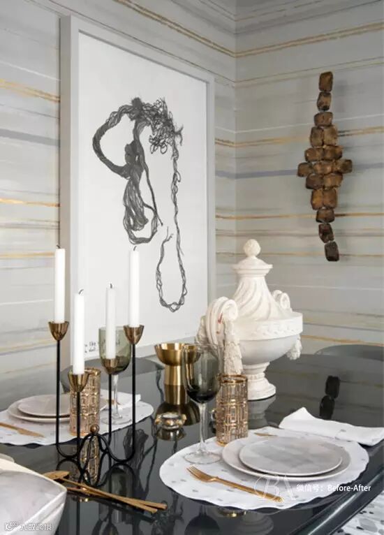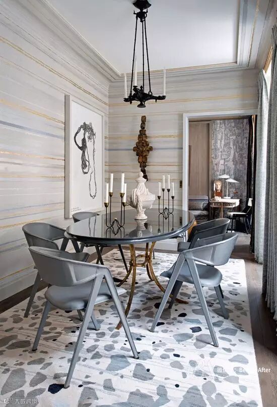 设计师Jean-Louis Deniot是一位低调时尚的优雅大师,他擅于利用各种灰色来呈现空间的奢华感,这个餐厅也不例外。以银桦色为底色的墙纸,在银色餐桌、餐椅面前备显轻盈柔和。亮白色的挂画、桌上装饰以及地毯起到提亮空间的作用,而地毯上的不规则斑点也用银色带来色彩呼应与趣味性。地板采用温柔的姜饼色,墙纸上的金色条纹、创意装饰物及餐桌桌腿则用黄水仙色来点缀。