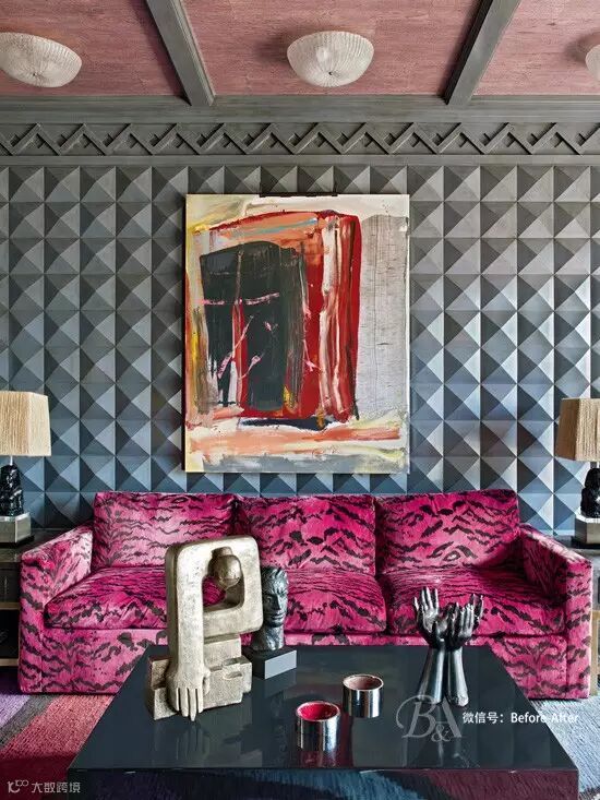 室内设计女神Kelly Wearstler也被称为情调大师,她以奢华迷人的设计风格闻名于世,其色彩搭配永远能给人们赏心悦目的启发。以下这个客厅来自美国加州的一处住宅,她将银色锥形装饰板铺满整个墙面,营造出强烈的现代金属感。墙边摆放的玫瑰红定制沙发,上面鲜艳的老虎纹散发出一丝妩媚与野性。沙发前的茶几和单椅采用浓重的墨玉色。地毯则由柔和的沙漠红和柔薰衣草色组合而成,为整个客厅打造出色彩丰富的视觉碰撞效果。