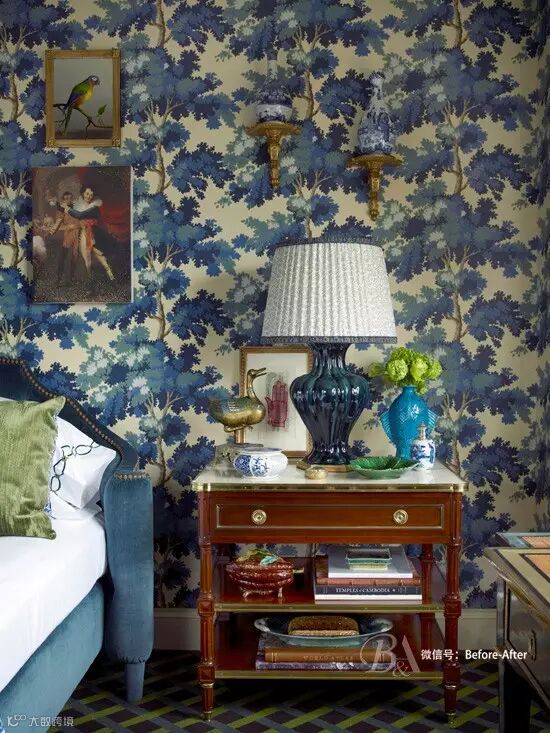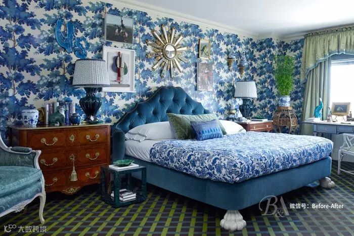 室内设计大师Alex Papachristidis则偏好于华丽的高雅风格,他擅长将中式与西式、古典与现代完美地融合在一起,优雅得令人难忘。在这个卧室中,使用深灰蓝印花墙纸能打造出空灵而优雅的居住感觉,古典气质却比任何现代家居更加摩登。他在床品、床头板和梳妆台都使用了这种深灰蓝,从而延伸了背景色。地毯采用苦巧克力色和柠檬绿相间的几何纹样,充满了现代气息。主要家具选择沉稳、古雅的皮革棕,如果在床头柜上摆放一对深灰蓝色台灯,瞬间让卧室极致优雅。还可以加入灰绿色点缀,比如靠包和窗帘。