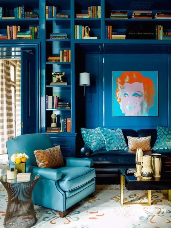 设计大师Steven Gambrel擅长在经典的设计中捕获灵感,并用其独特视角诠释,创造出不可思议的设计细节,使居室重新焕发生机。在这个书房的设计中,背景选用蓝色会起到稳定情绪、集中注意力的心理效果。所以这套配色方案在墙面木作用色上使用了清爽的蓝鸟色。当蓝鸟色搭配比它更淡些的浅孔雀蓝沙发和靠包时,空间会显得更加凉爽。为了让空间具有温暖的色调,在家具选择上,可以加入蜂蜜色书桌,以及橙赭色单椅。如果再加上魅影黑的点缀,空间则会具有鲜明的都市感。
