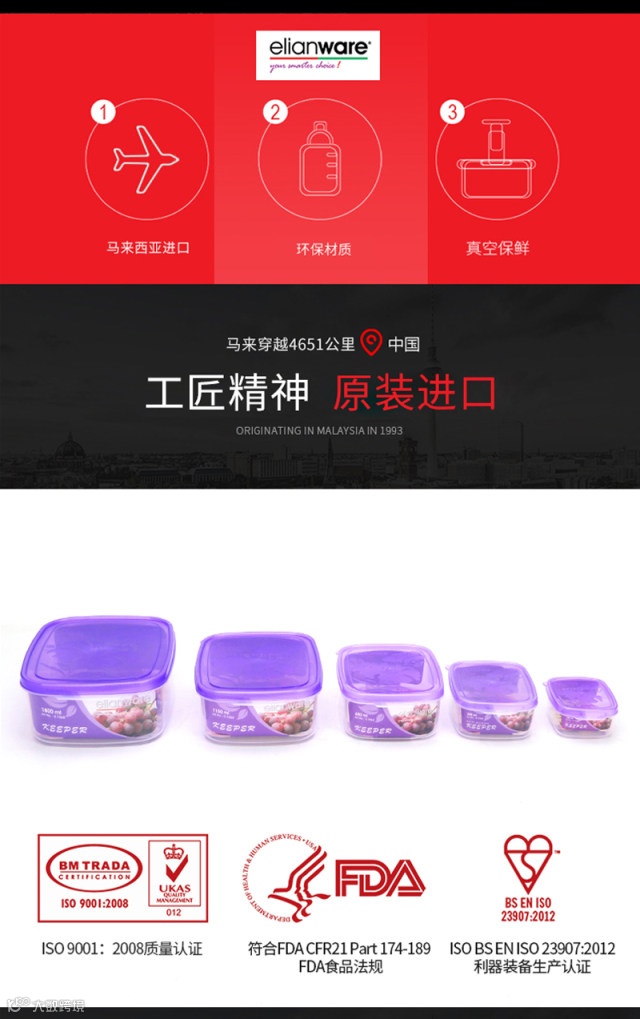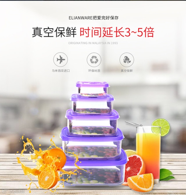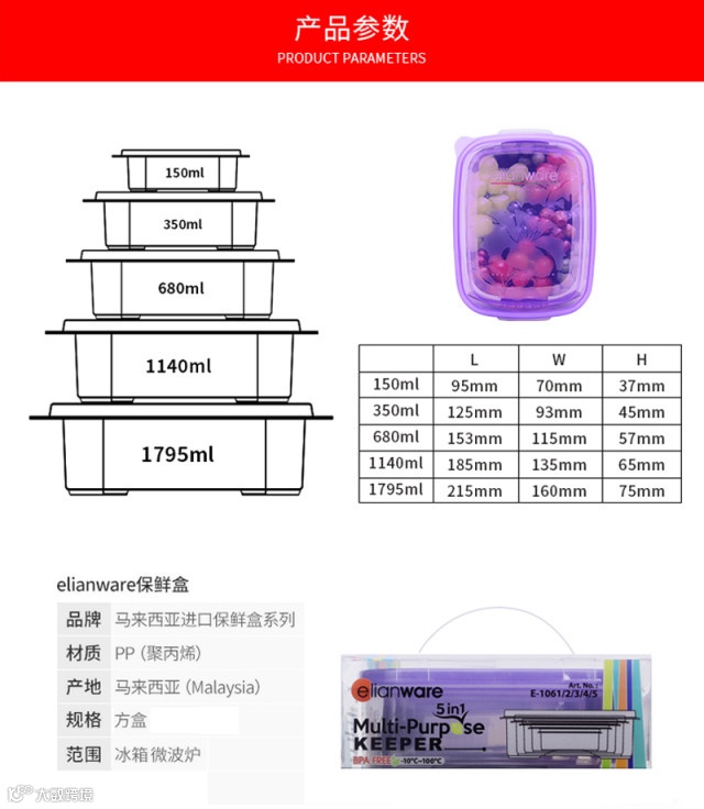 【余额提货】Elianware马来西亚食品级保鲜收纳盒五件套E-1065
