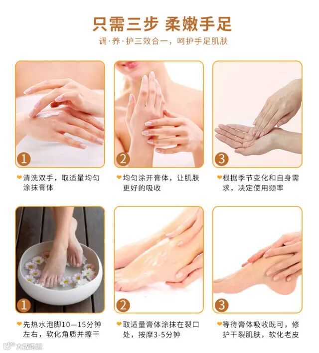 含有大蕉、牛油果、小雨燕窝等天然植物成分,保湿滋润修复效果特别突出,特别是秋冬干燥季节,手足干裂、脱皮、冻疮等引起的手足干裂粗糙问题,呵护手足肌肤。