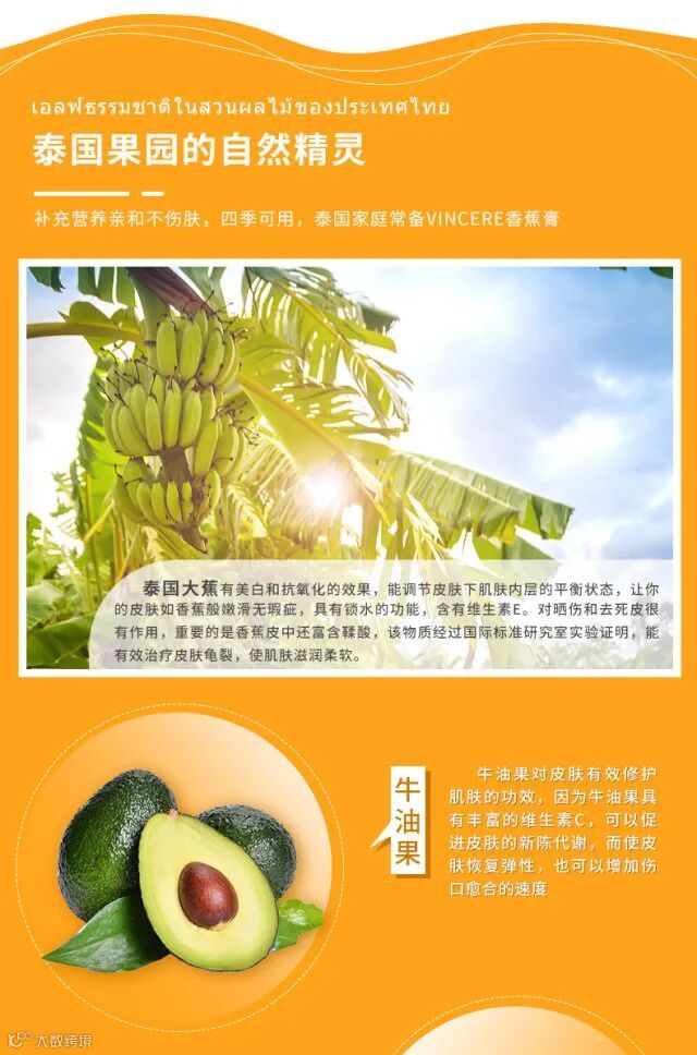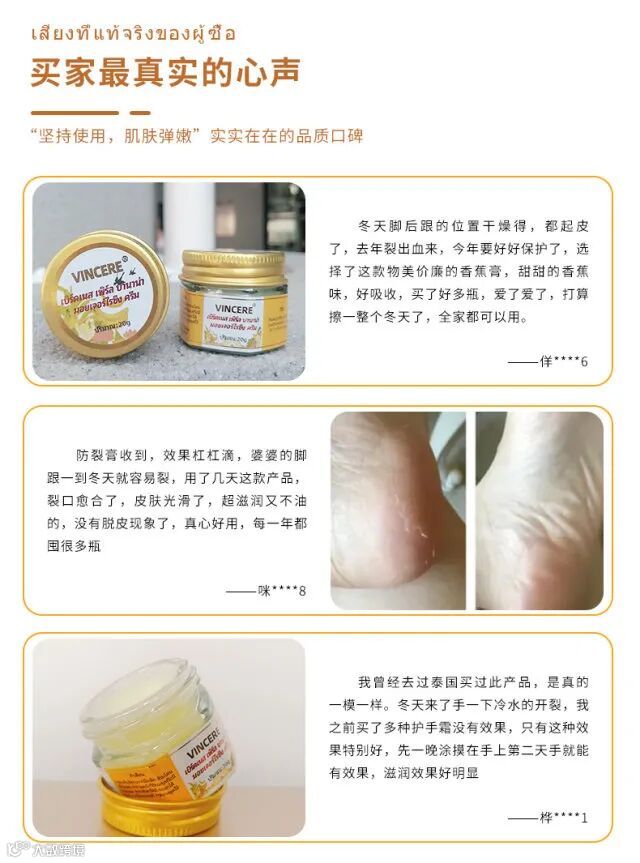 泰国VINCERE燕窝珍珠香蕉润肤膏不仅完全保留了天然植物的精华,同时加入了具有美白、修复作用的珍珠和抗氧化的燕窝,减少皮肤干裂、皱纹以及外部对皮肤的刺激,使皮肤保持白皙与弹性。让各个部位容易粗糙的皮肤如足部、腹部、手指脚趾、关节、膝盖都能得到长效的滋润。