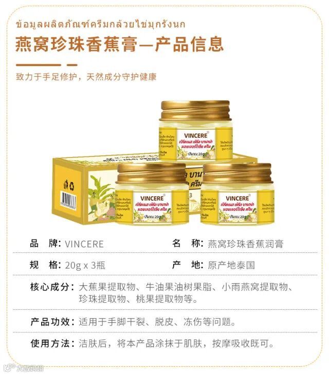 泰国VINCERE燕窝珍珠香蕉膏 解决干裂、手足裂口