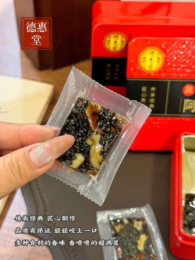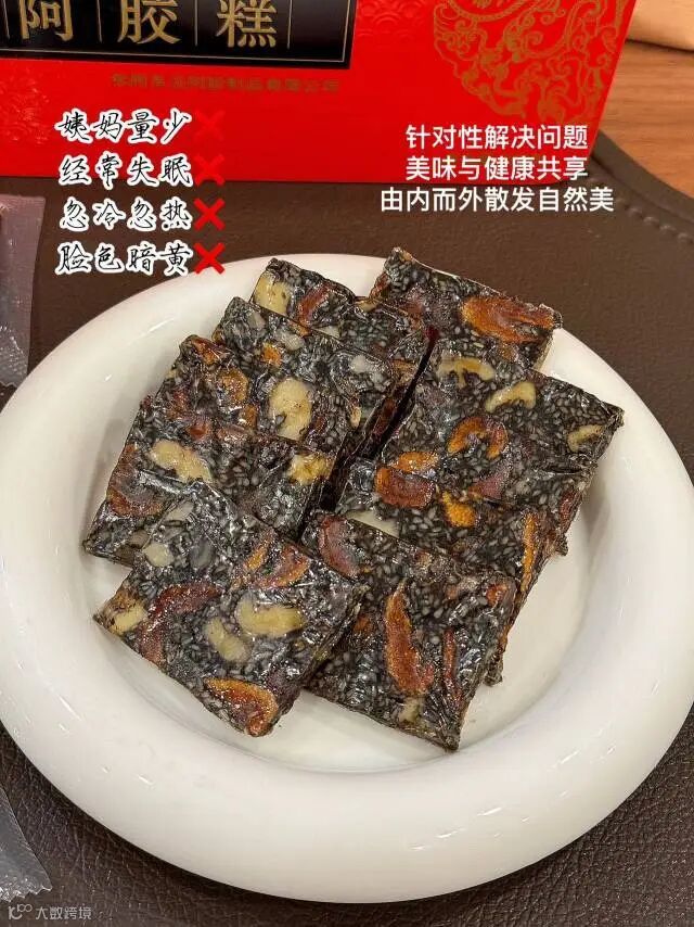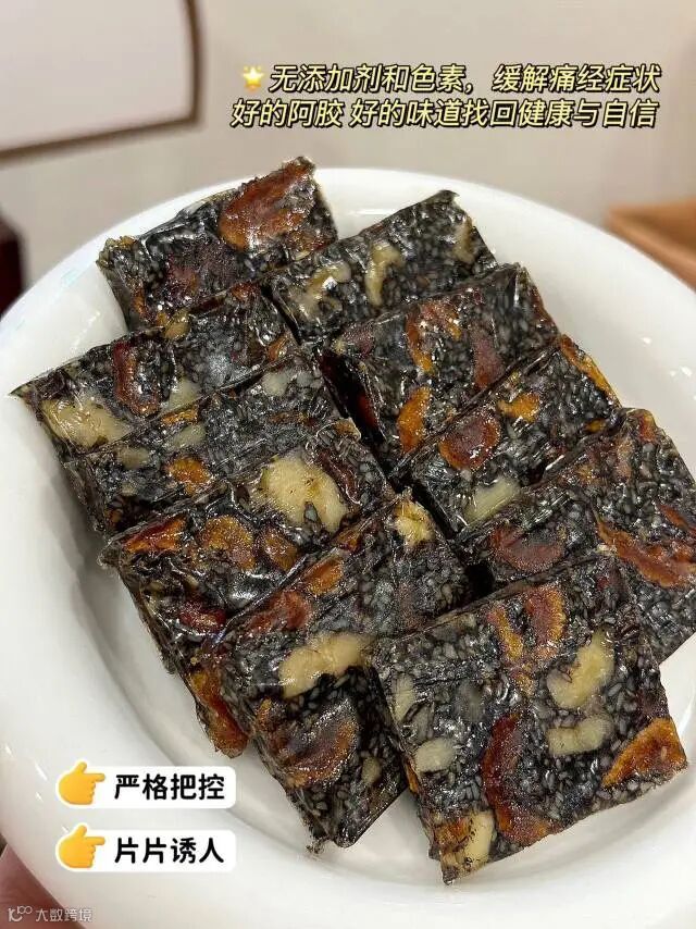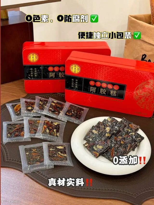 块块都是真材实料,颗粒饱满,中医组方食材清晰,吃的放心;色泽鲜亮,更有食欲,都说能吃上纯手工无添加阿胶糕是一种幸福,上好的阿胶糕,🎊遇热变软易拉丝