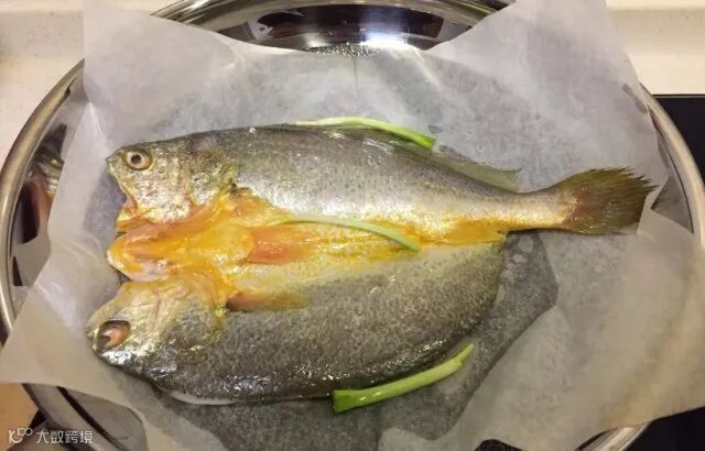①黄鱼鲞不开袋放入清水中自然解冻后,用厨房纸吸干水分放入盘中。