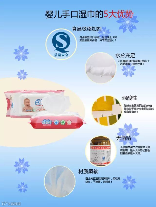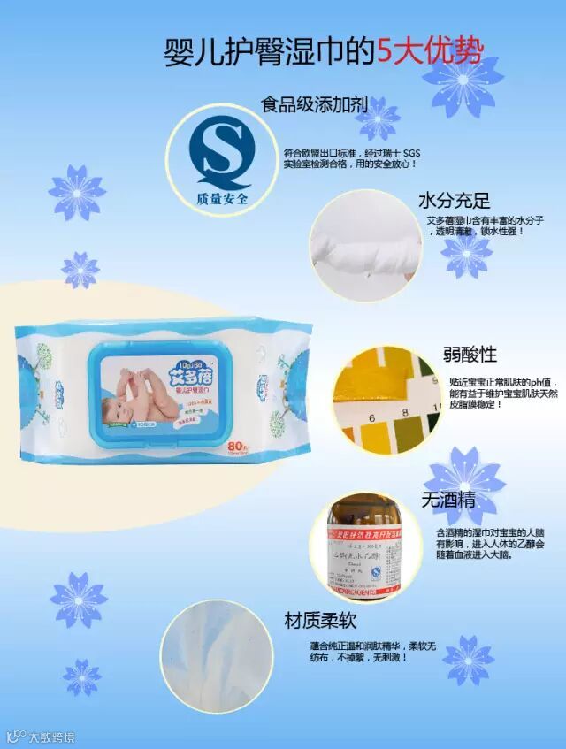 ”艾多蓓”婴儿手口、护臀湿巾让宝宝安全、妈妈放心的高品质婴儿湿巾。适用于0-6岁婴幼儿使用。使用全天然基布和配方,给宝宝娇嫩肌肤最滋润、柔软的呵护。