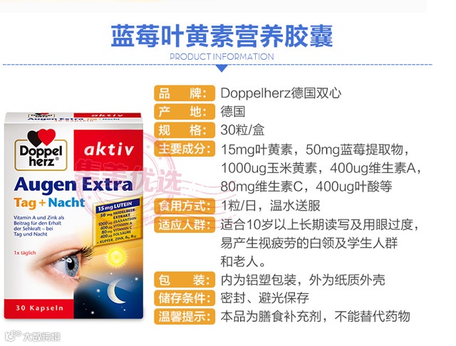【保健专场】德国Doppelherz双心蓝莓叶黄素胶囊30粒 原价:109元 粉丝群补贴价:85元