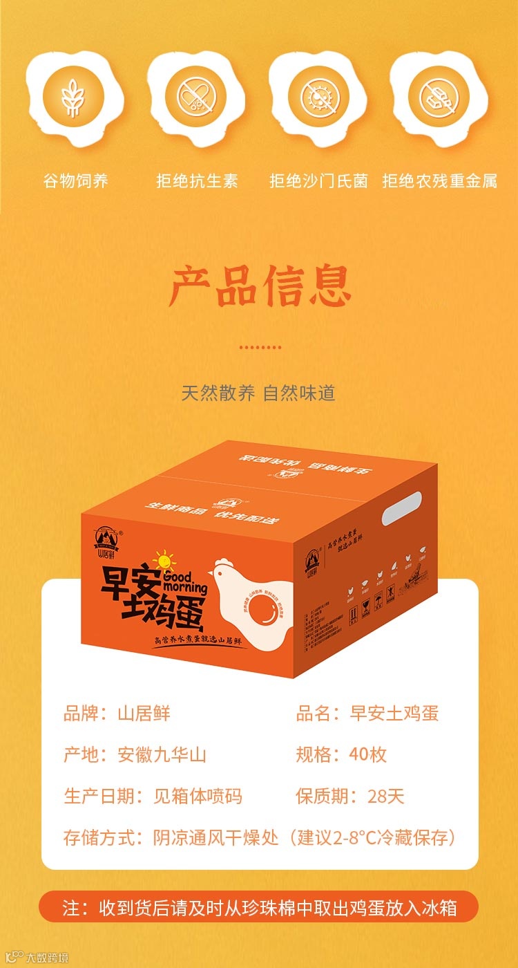 【注意事项】:(发货包装不能存放鸡蛋)收到货一定要立即完全解除它的包装,放冰箱保鲜或放到通风阴凉处,勿久闷,勿水冲洗,勿横放,食材不易,请注意保存