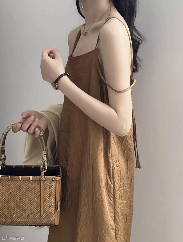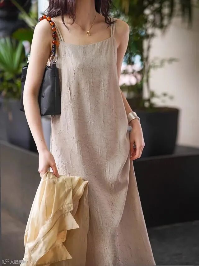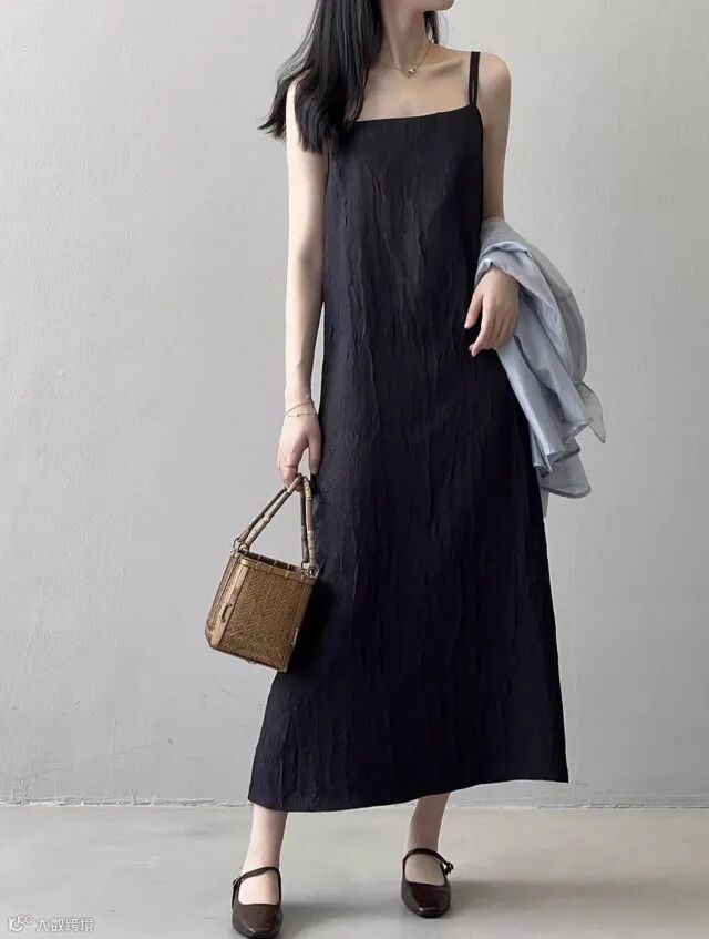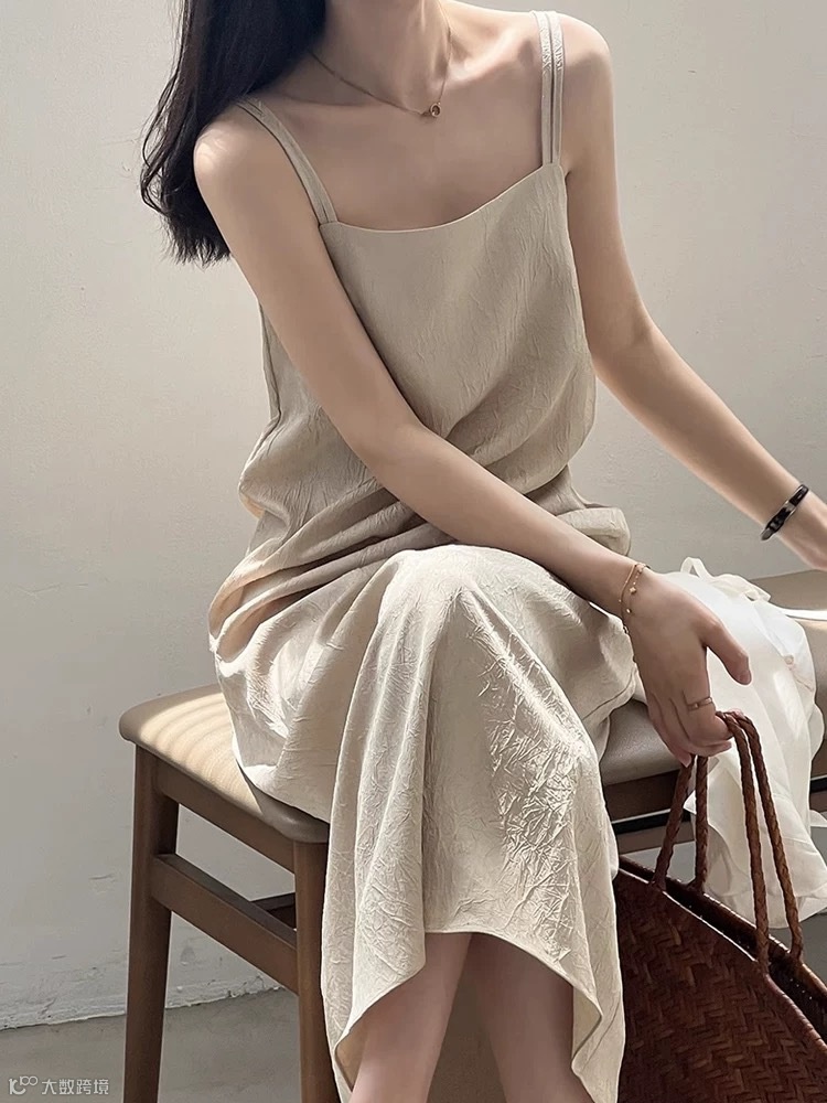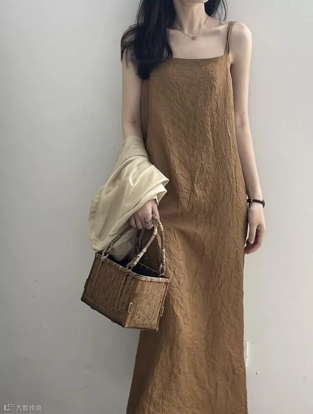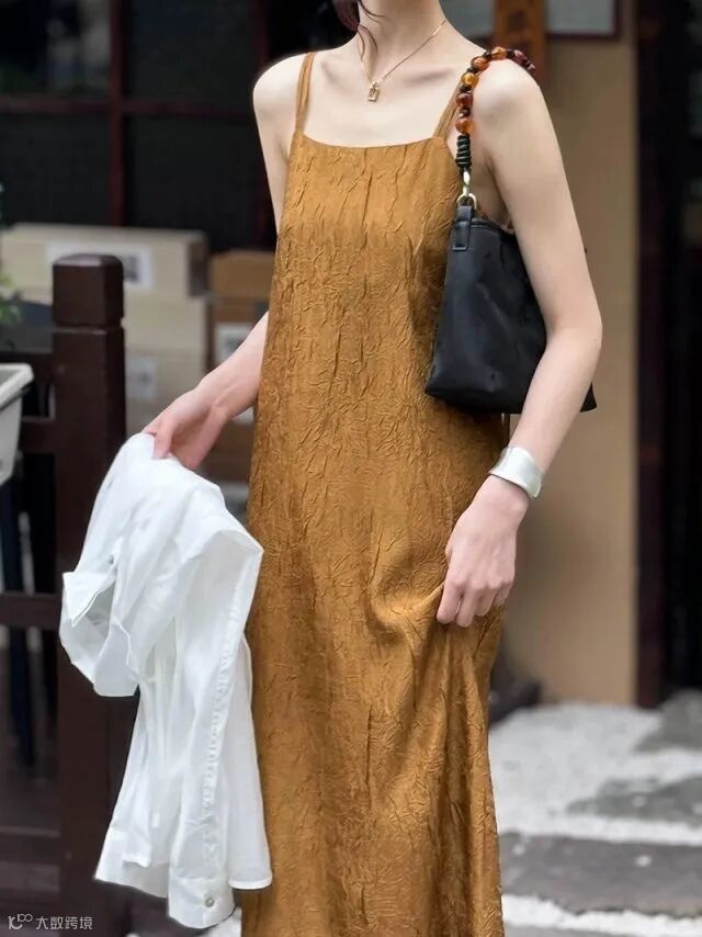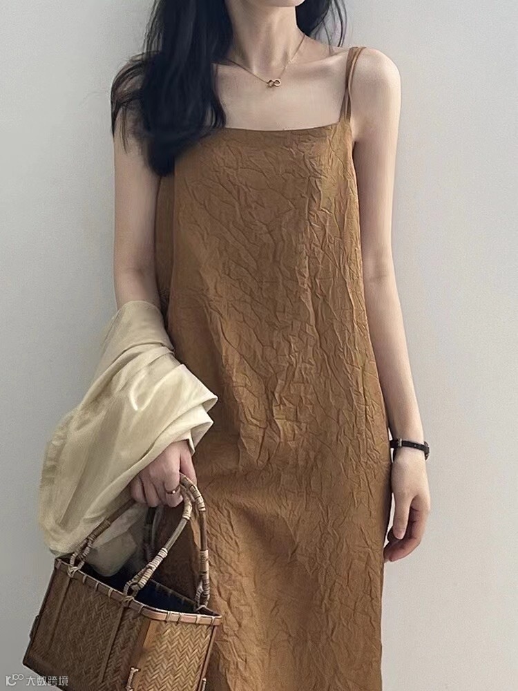 双肩带褶皱肌理感美式吊带连衣裙,高冷御姐风今年流行爆款裙子~