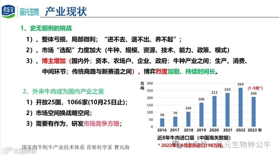 肉牛产业正面临史无前例的挑战,对于单体养牛户来说,一是面临各项饲养成本不断提高的财政压力,二是出肉量低的产出焦虑,三是进口牛肉持续增加,给国内肉牛产业造成较大的冲击。