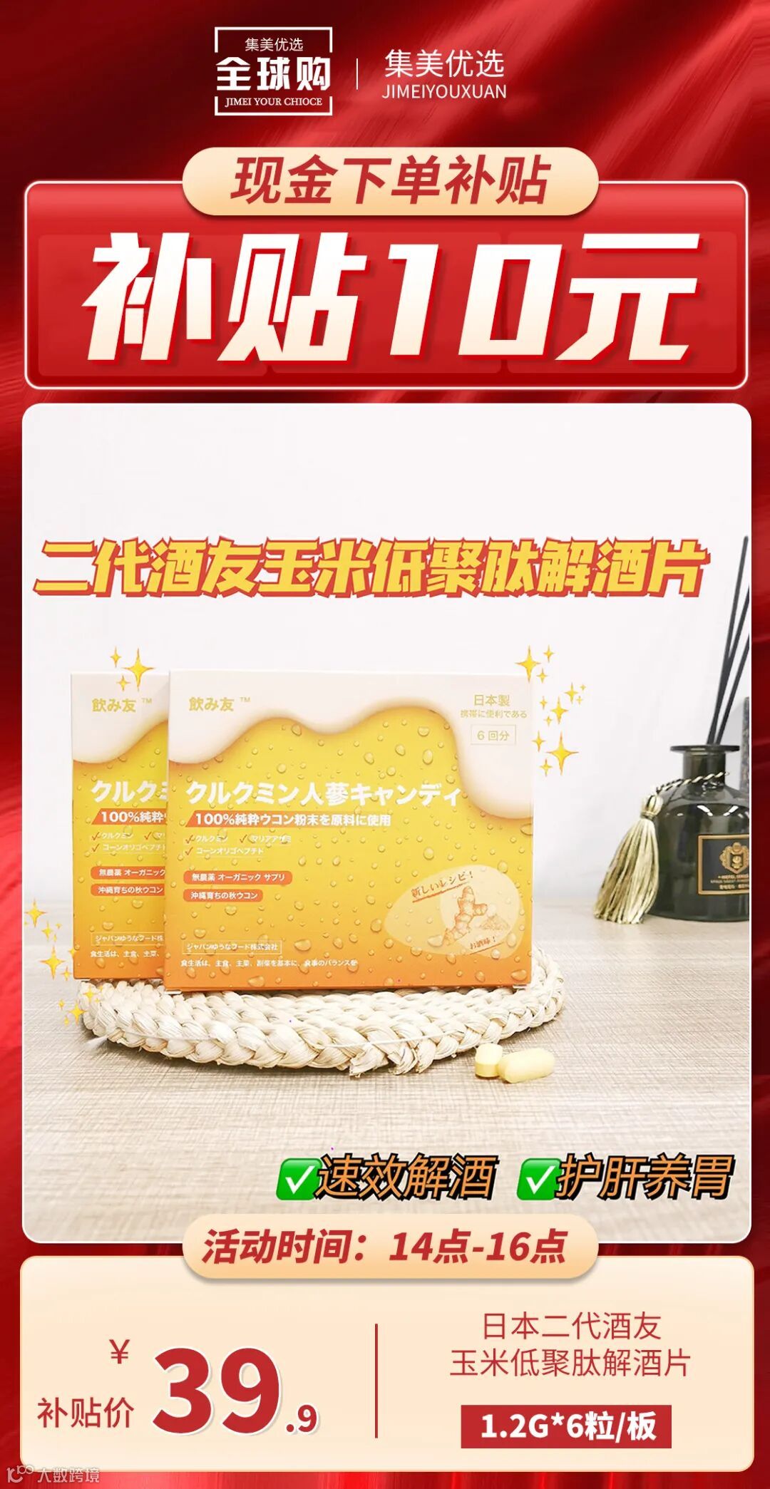 【补贴2小时】日本二代酒友玉米低聚肽解酒片1.2g*6粒/板 原价:59元 粉丝群补贴价:39.9元