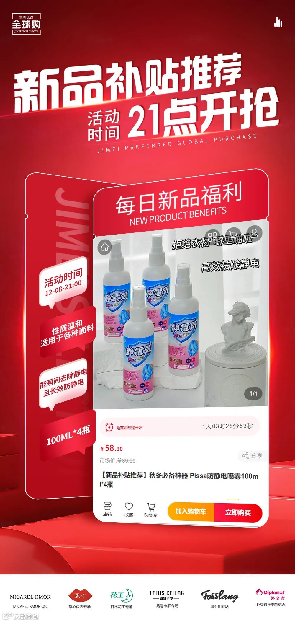 【新品补贴推荐】秋冬必备神器 Pissa防静电喷雾100ml*4瓶 原价:89元 粉丝群补贴价:58.3元