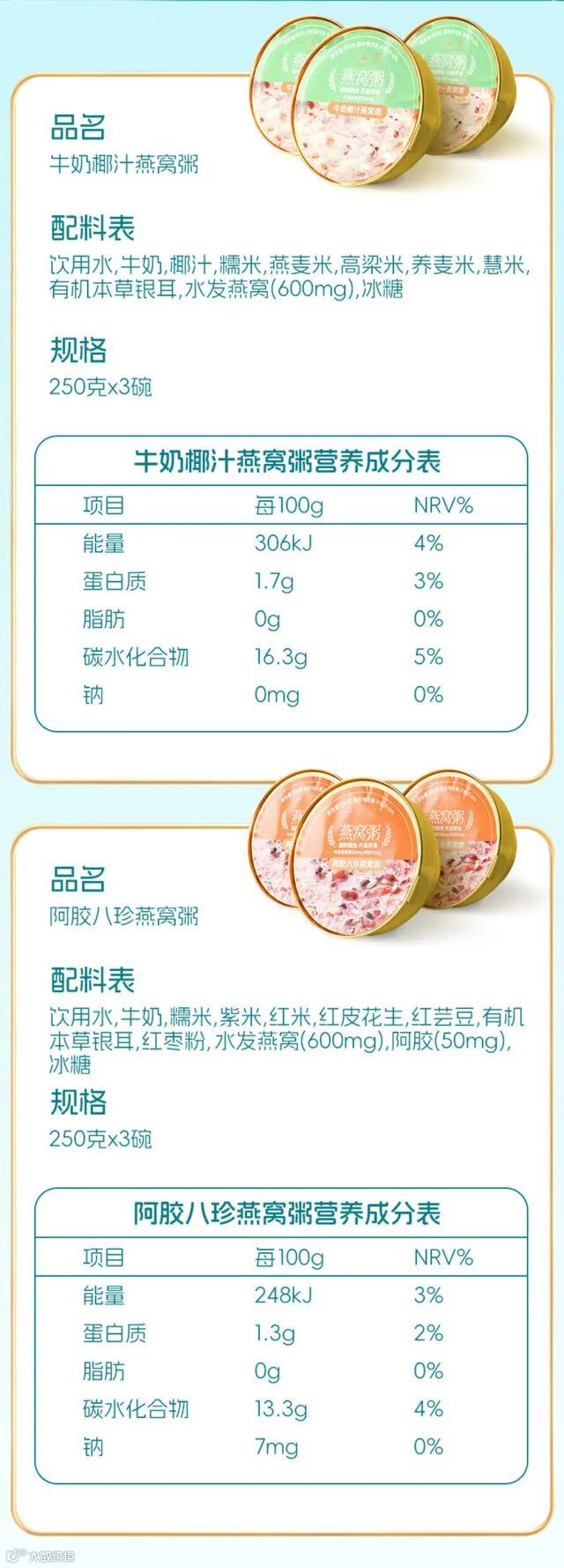 1牛奶椰汁燕窝粥® 配料表:燕窝+牛奶+椰汁+糯米+燕麦米+高梁米+荞麦米+薏米+有机本草银耳+冰糖