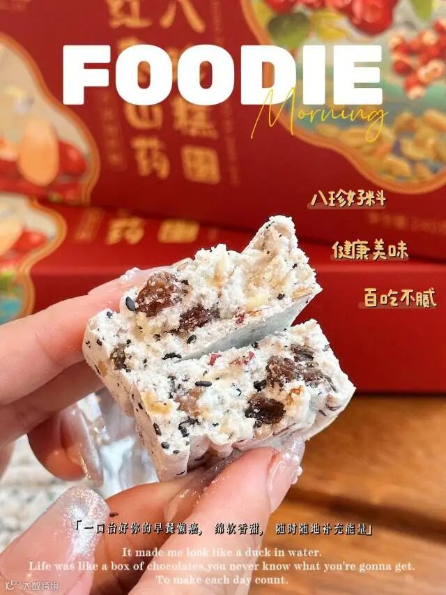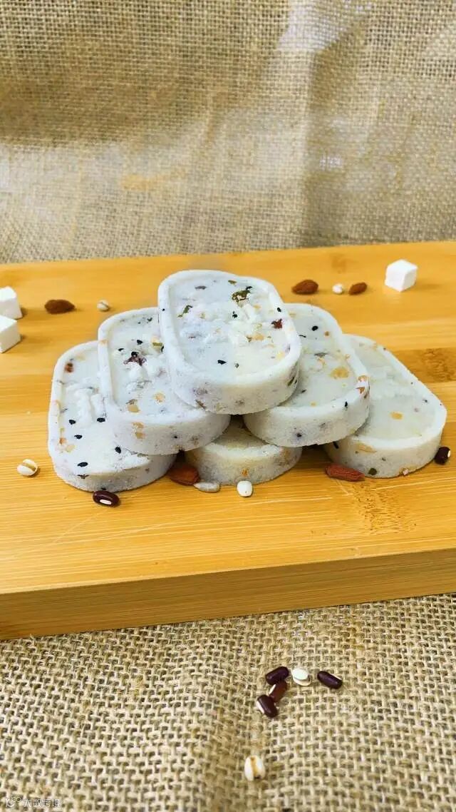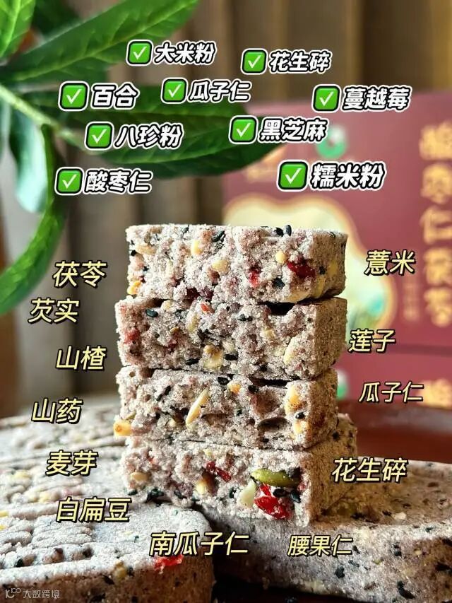 配料表:糯米粉、大米粉、麦芽糖醇、八珍粉(芡实、茯苓、莲子、薏米、山楂、山药、白扁豆、麦芽)瓜子仁、南瓜子仁、腰果、黑芝麻、花生碎、蔓越莓、食用植物油