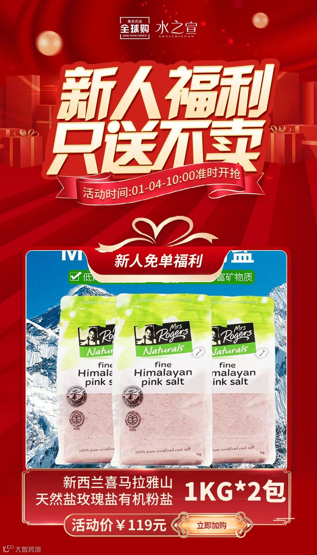 【新人免单福利】新西兰Mrs Rogers喜马拉雅山天然盐玫瑰盐有机粉盐1kg*2包 原价:189元 粉丝群补贴价:119元