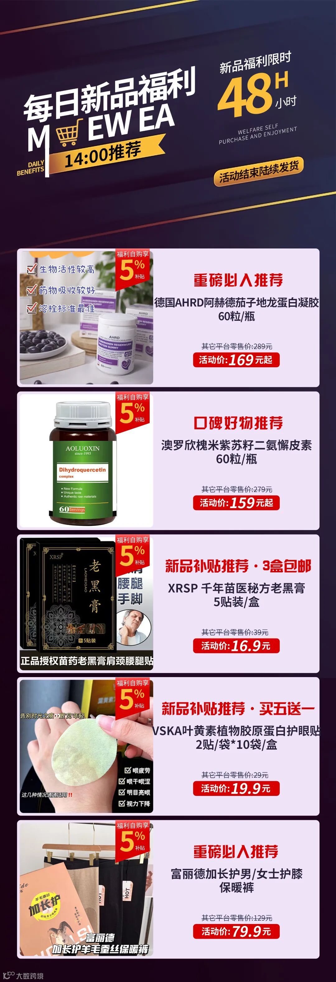 【重磅必入推荐】德国AHRD阿赫德茄子地龙蛋白凝胶 60粒/瓶 【口碑好物推荐】美国原装进口澳罗欣”槐米紫苏籽二氨懈皮素60粒/瓶 【新品补贴推荐·3盒包邮】XRSP 千年苗医秘方老黑膏5贴装/盒 【新品补贴推荐·买五送一】VSKA叶黄素植物胶原蛋白护眼贴2贴/袋*10袋/盒 【重磅必入推荐】富丽德加长护男/女士护膝保暖裤 🔹活动限时 48小时