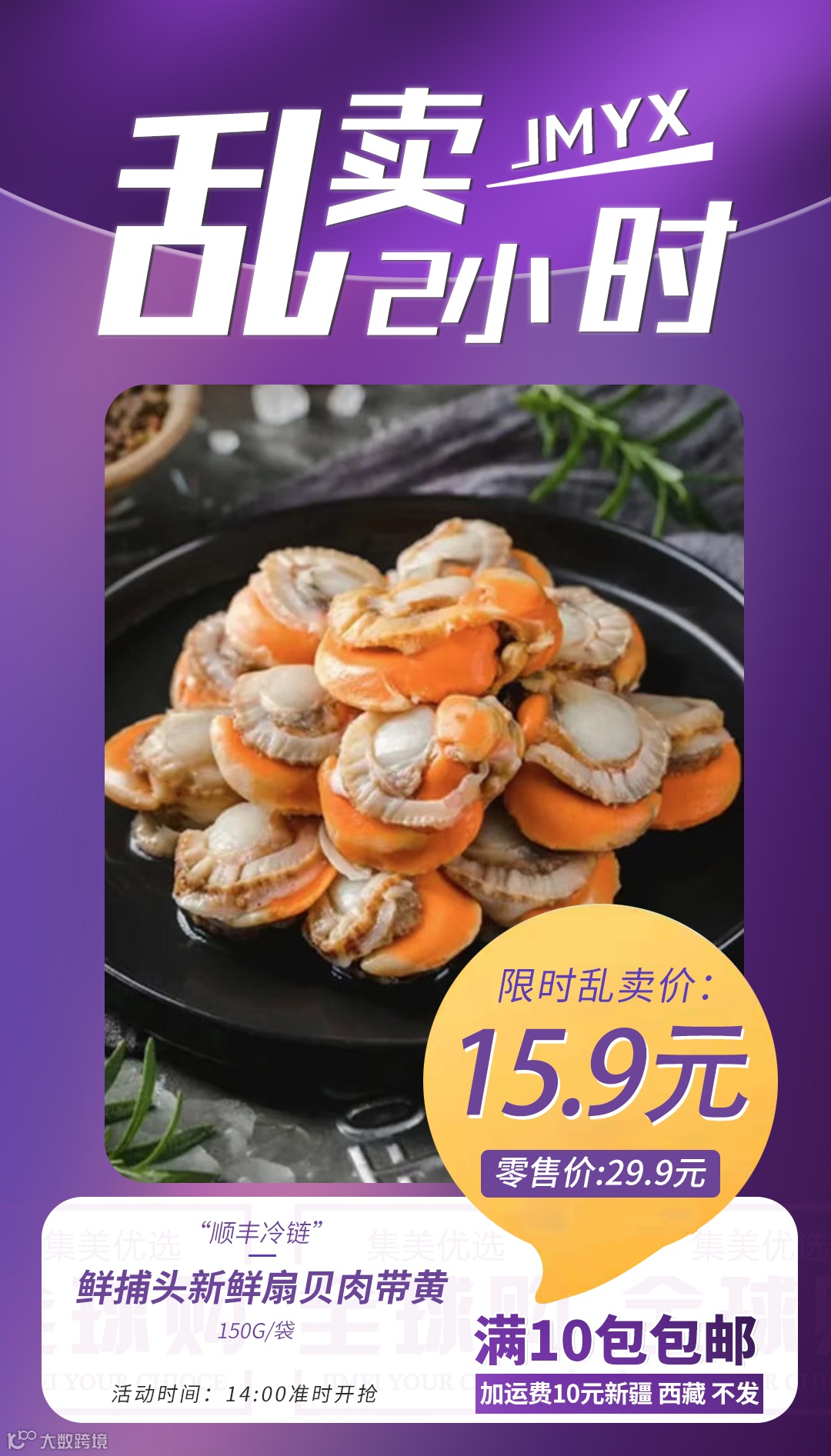 【乱卖2小时·10包包邮】鲜捕头新鲜扇贝肉带黄150g/袋(顺丰冷链)