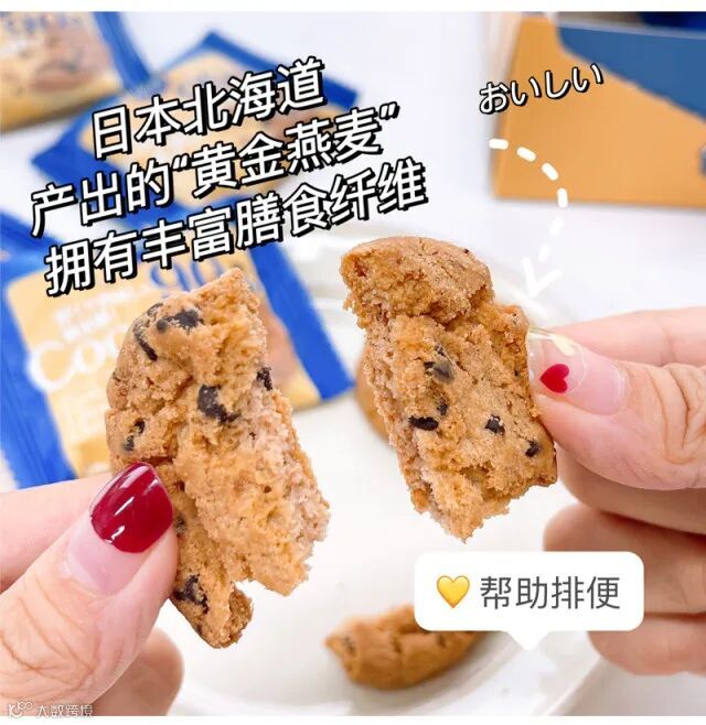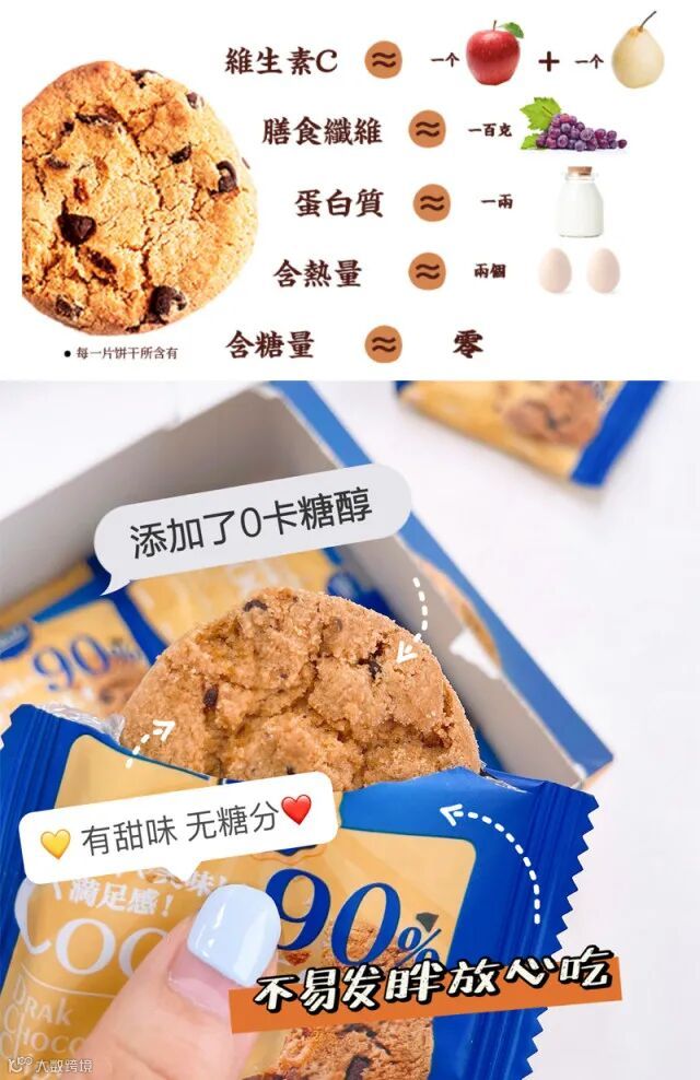 主要成分:小麦粉、黑巧克力(可可液块、麦芽糖醇、可可脂、磷脂、可可粉、食用香精)、植物油、圆苞车前子壳、麦芽糖醇、异麦芽酮糖醇、菊粉、燕麦片、碳酸氢钠、碳酸氢铵、食用盐、食用香精