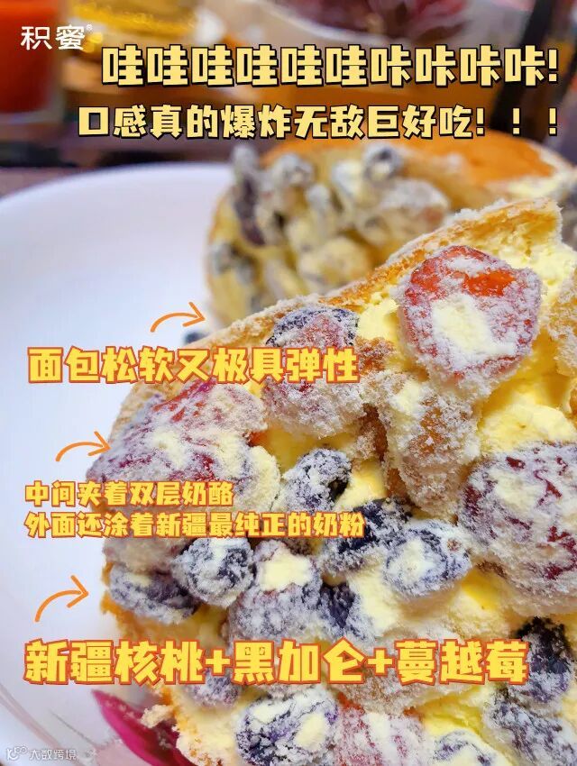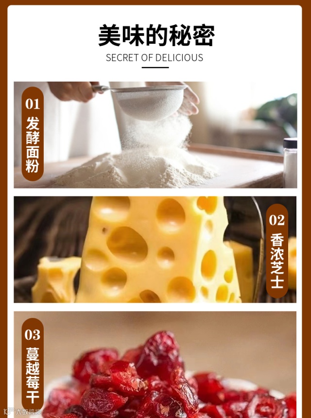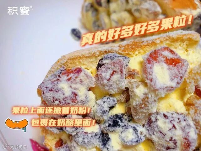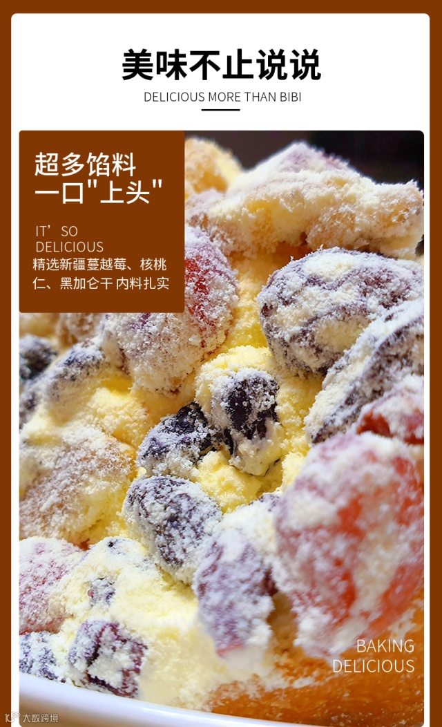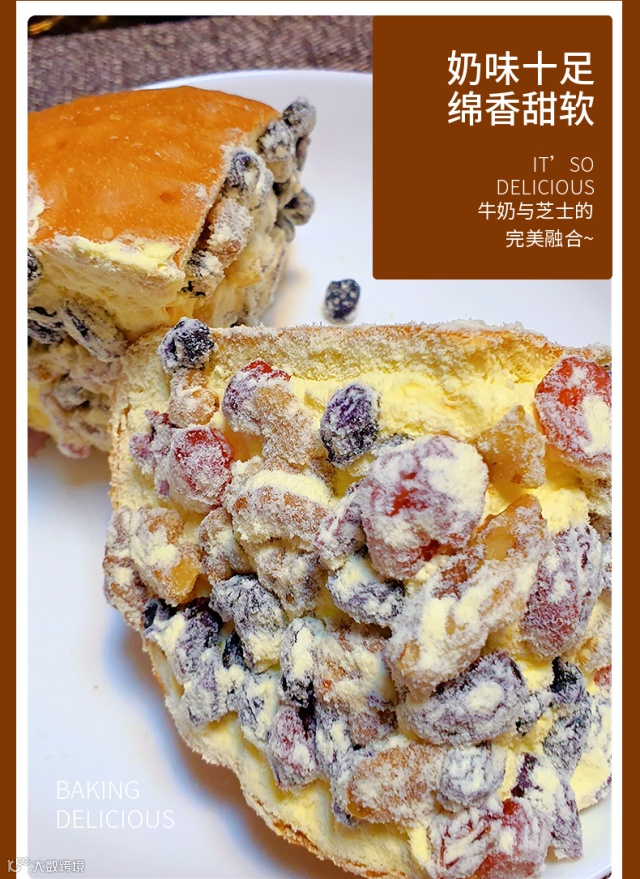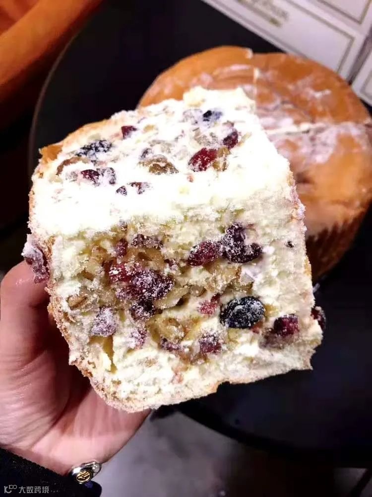【配料表】优质小麦粉,新鲜鸡蛋,纯牛奶,黄油,奶油,芝士,酵母粉,核桃仁,黑加仑,蔓越莓