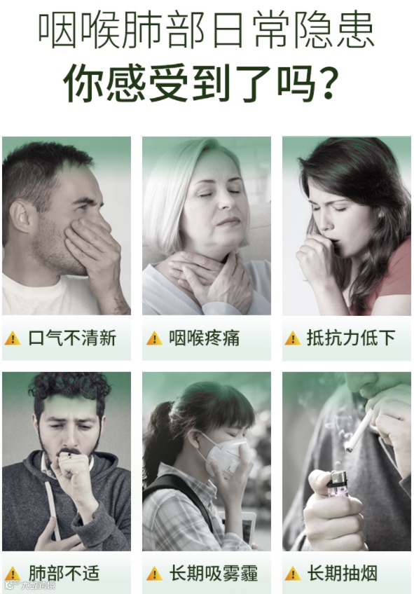 经常抽烟家里有小孩的,强烈建议备上几瓶,因为二手烟中焦油、苯并芘等有害物是一手烟的5倍以上,很容易引发咽炎、呼吸道疾病。每天一颗清肺利咽,减少有害物侵入!