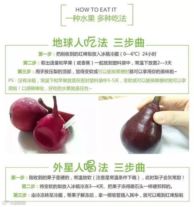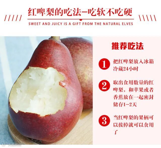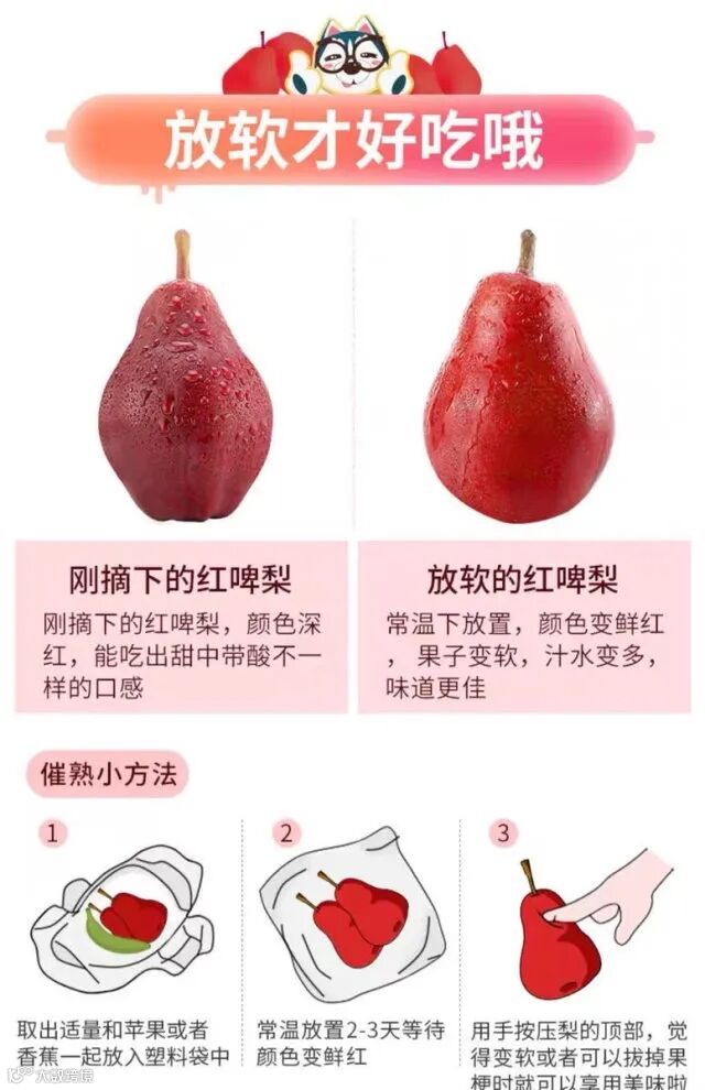 1将红啤梨与香蕉或者苹果放一起,用袋子密封好,常温放置3-4天,手捏变软,果色呈鲜红色,拔掉果把即可食用。