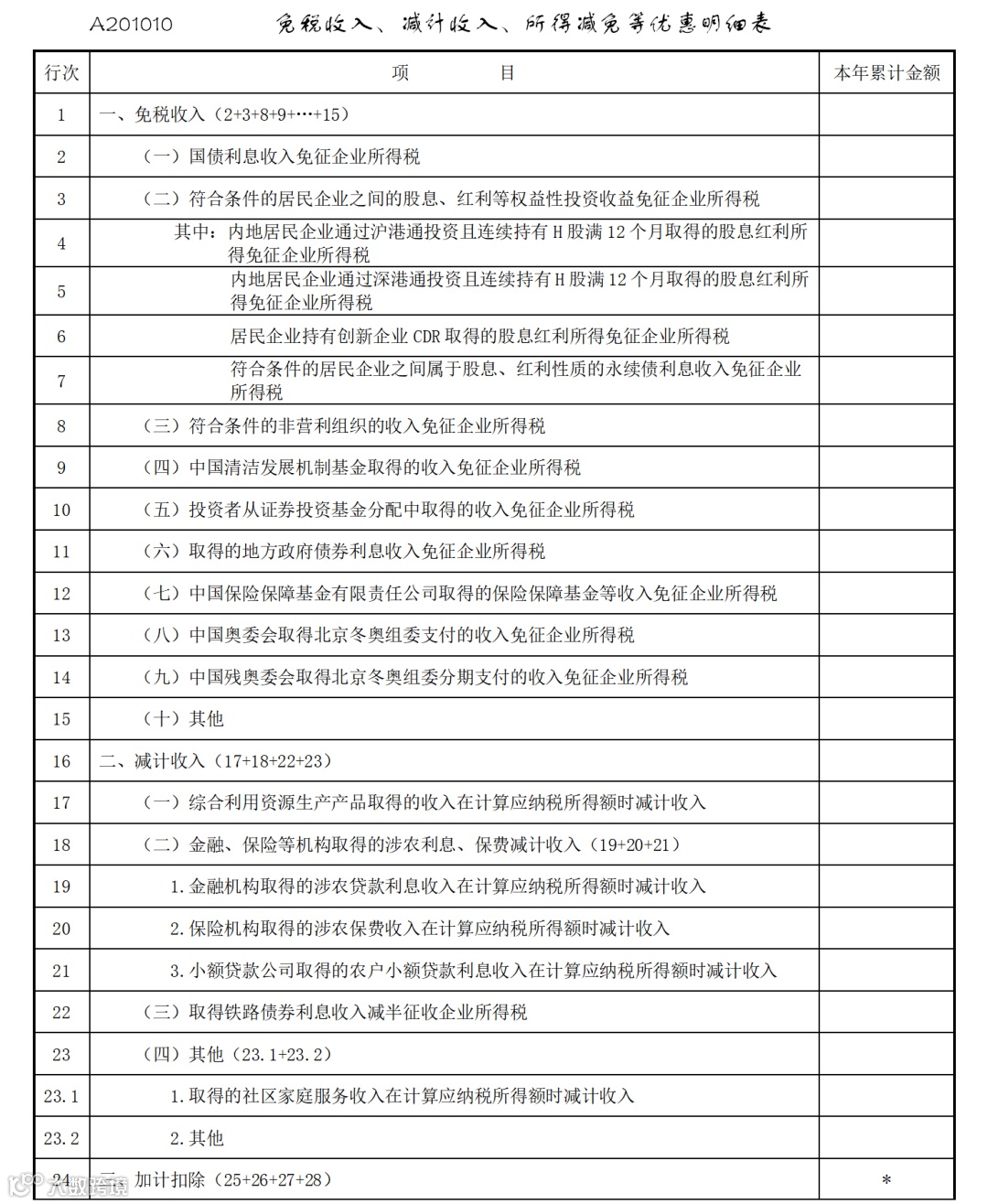 现在呢,我就告诉大家,如何在申报企业所得税年终汇算清的时候,填报加计扣除,首先大家要找到这张表,看文稿,《A201010免税收入、减计收入、所得减免等优惠明细表》,表中的第28栏,安置残疾人员所支付的工资加计扣除,就是用来填报加计扣除的。