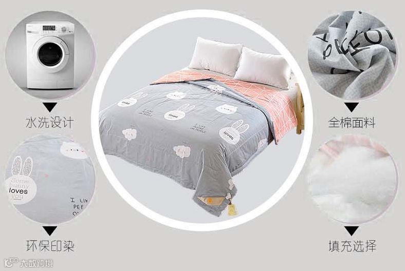 精致的绗缝、包边、被扣设计。牢牢固定被胎,防止跑毛增加被芯使用寿命。