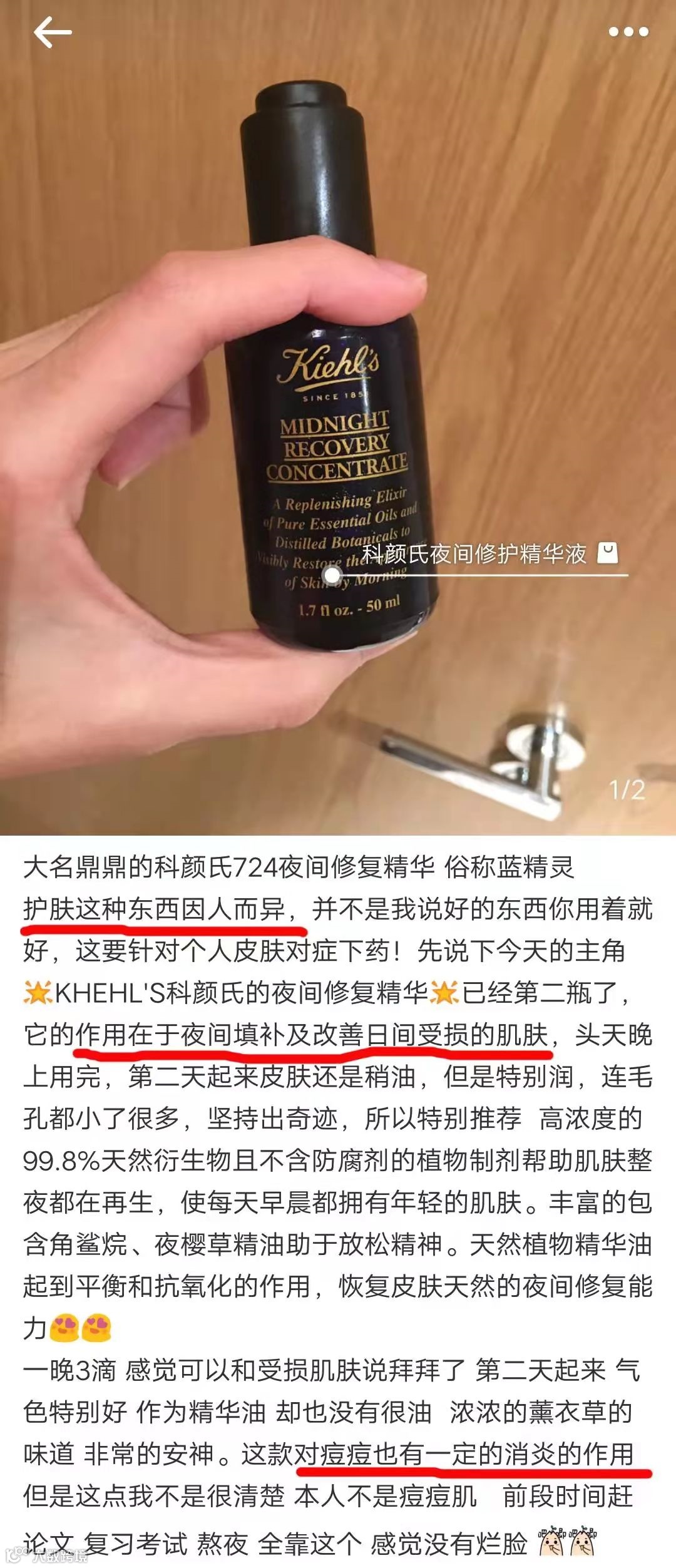 Kiehl's科颜氏午夜精华99.8天然成份