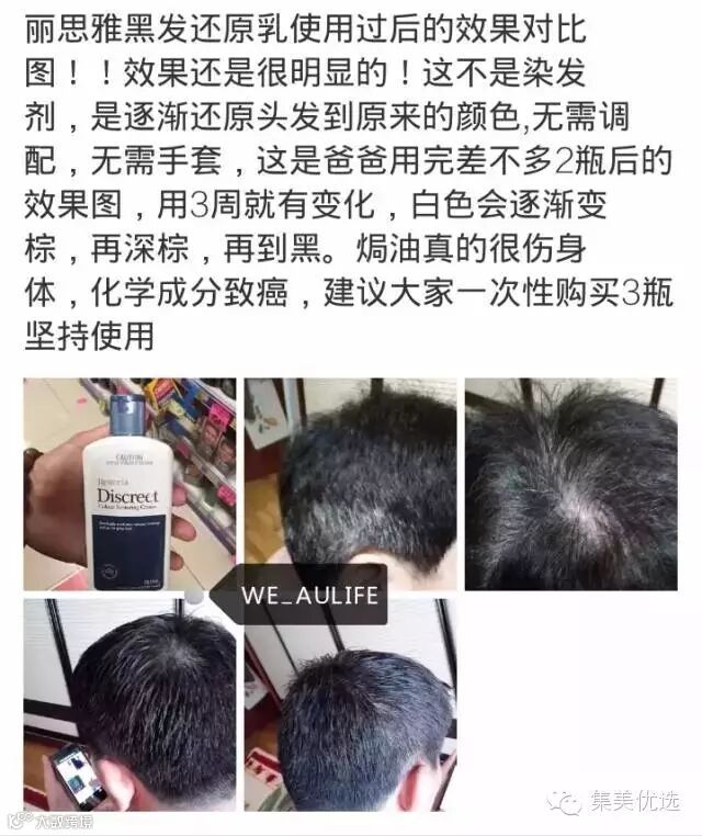 丽丝雅逐渐变黑黑发乳及黑发液与头发产生天然化学作用,能于2至3星期内将你的头发逐渐回复天然色调。头发的颜色可透过使用的频密程度来调控,更可按你的心意来选择染发范围,将头发色泽由灰白变浅啡,再逐渐变成深啡和乌黑,过程自然。